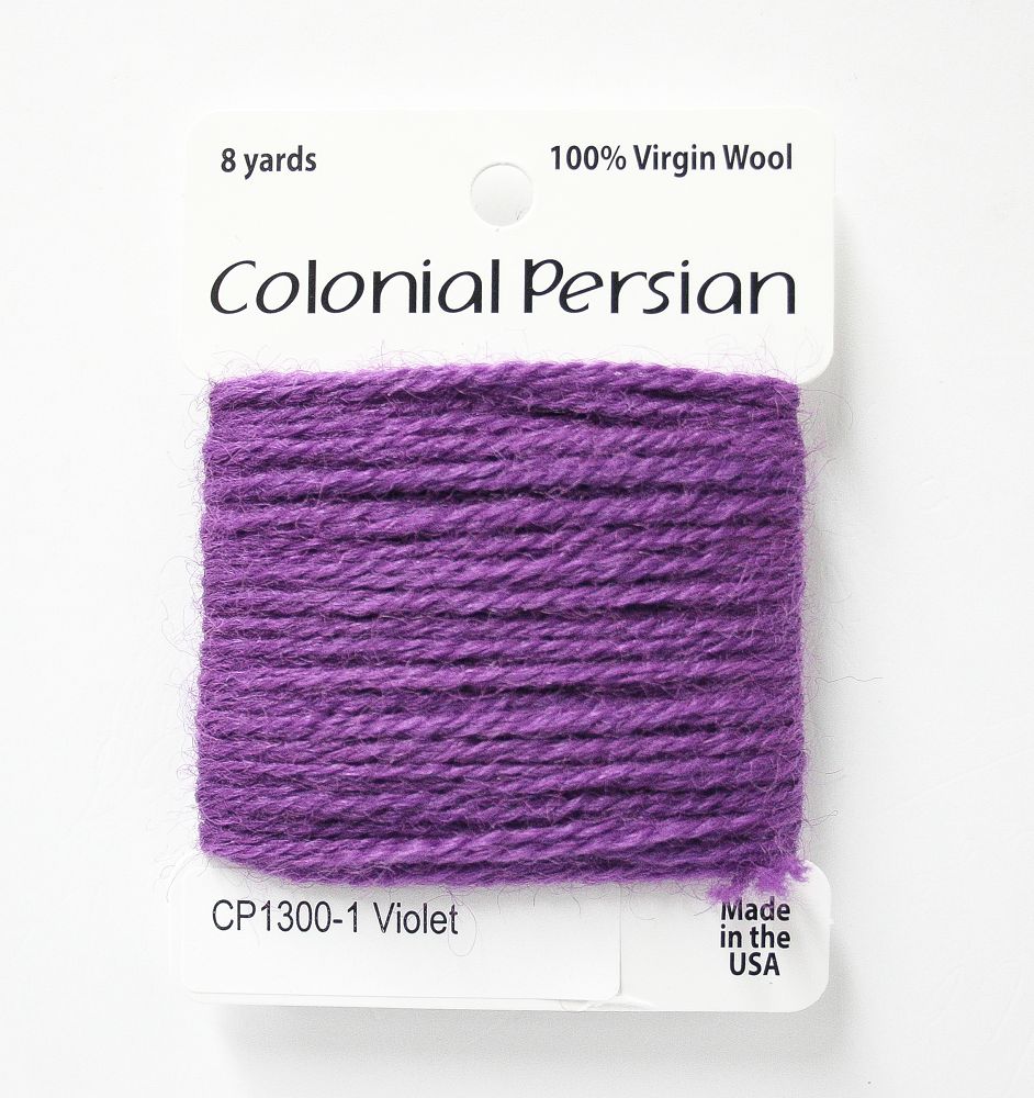 This is Colonial Persian from Colonial Needle Co in color Violet. A traditional needlepoint fiber. Comparable to the now-discontinued Paternayan wool. Use all three strands on 10 mesh, 2 strands on 13 mesh, 1 strand on 18 mesh. 1 strand is about equivilant to 1 strand of crewel wool.