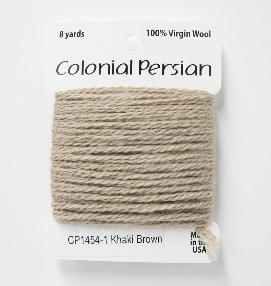 This is Colonial Persian from Colonial Needle Co in color Khaki Brown. A traditional needlepoint fiber. Comparable to the now-discontinued Paternayan wool. Use all three strands on 10 mesh, 2 strands on 13 mesh, 1 strand on 18 mesh. 1 strand is about equivilant to 1 strand of crewel wool.