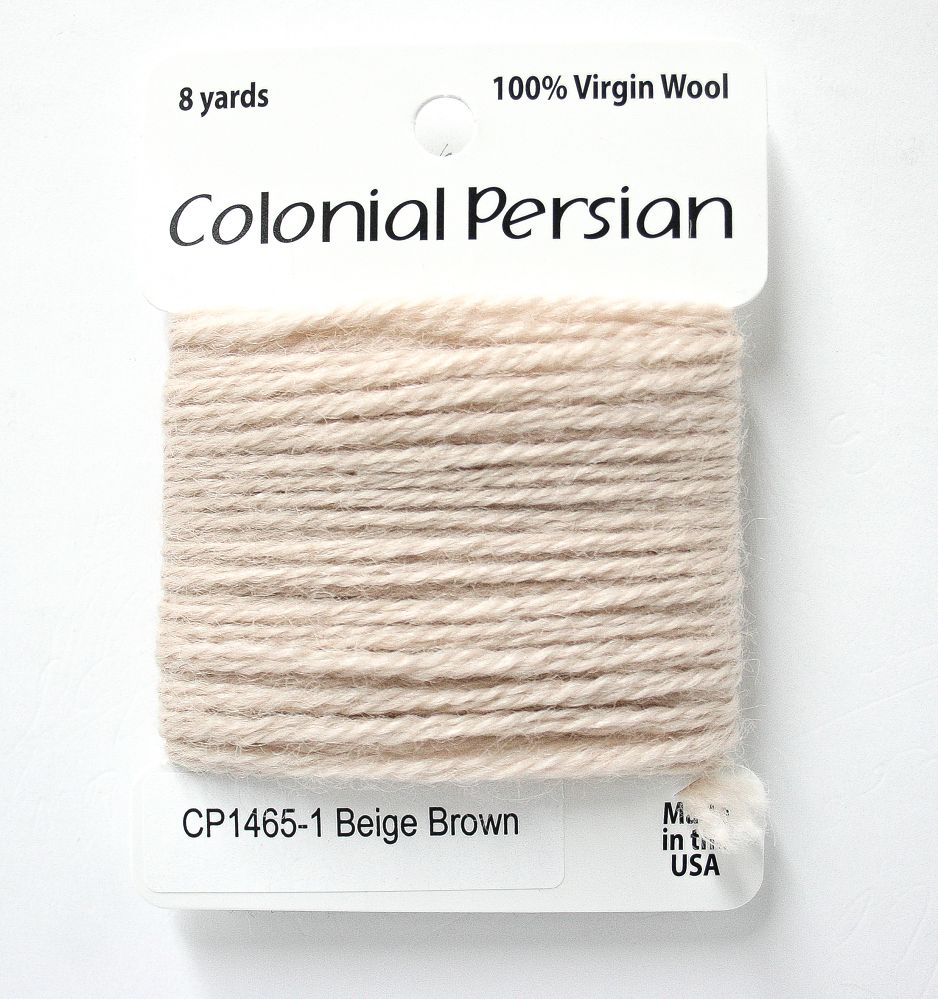 This is Colonial Persian from Colonial Needle Co in color Beige Brown. A traditional needlepoint fiber. Comparable to the now-discontinued Paternayan wool. Use all three strands on 10 mesh, 2 strands on 13 mesh, 1 strand on 18 mesh. 1 strand is about equivilant to 1 strand of crewel wool.