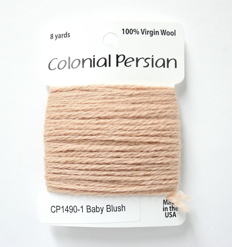 This is Colonial Persian from Colonial Needle Co in color Baby Blush. A traditional needlepoint fiber. Comparable to the now-discontinued Paternayan wool. Use all three strands on 10 mesh, 2 strands on 13 mesh, 1 strand on 18 mesh. 1 strand is about equivilant to 1 strand of crewel wool.