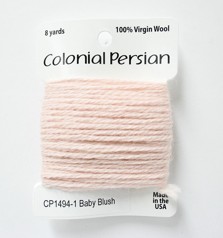 This is Colonial Persian from Colonial Needle Co in color Baby Blush. A traditional needlepoint fiber. Comparable to the now-discontinued Paternayan wool. Use all three strands on 10 mesh, 2 strands on 13 mesh, 1 strand on 18 mesh. 1 strand is about equivilant to 1 strand of crewel wool.