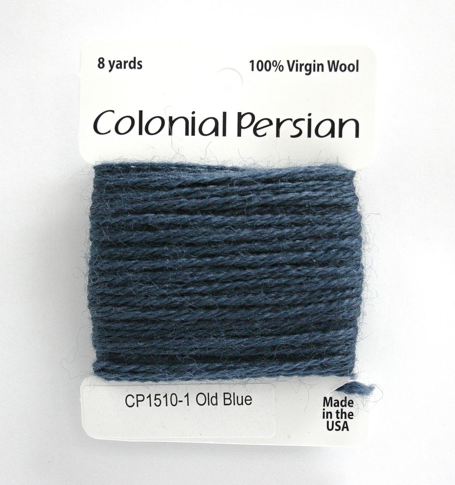 This is Colonial Persian from Colonial Needle Co in color Old Blue. A traditional needlepoint fiber. Comparable to the now-discontinued Paternayan wool. Use all three strands on 10 mesh, 2 strands on 13 mesh, 1 strand on 18 mesh. 1 strand is about equivilant to 1 strand of crewel wool.