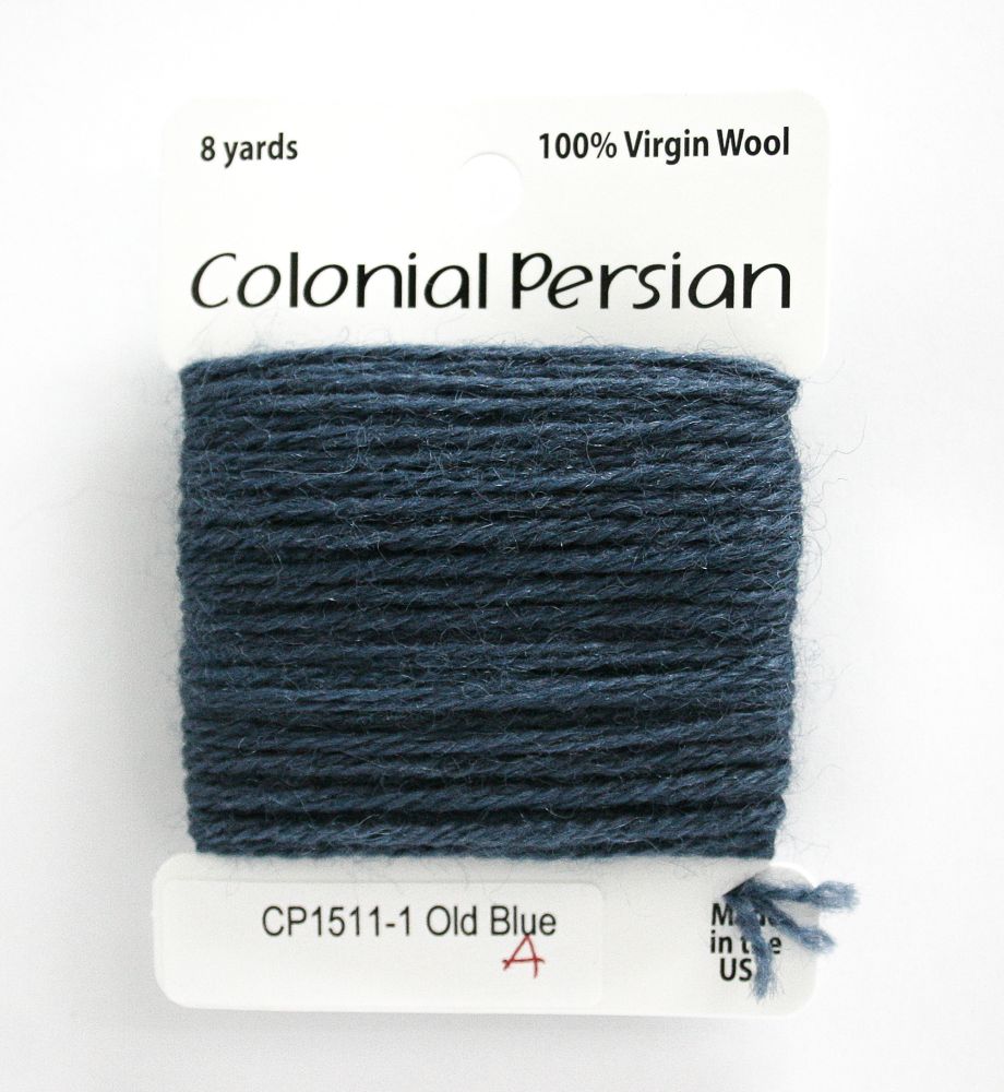 This is Colonial Persian from Colonial Needle Co in color Old Blue. A traditional needlepoint fiber. Comparable to the now-discontinued Paternayan wool. Use all three strands on 10 mesh, 2 strands on 13 mesh, 1 strand on 18 mesh. 1 strand is about equivilant to 1 strand of crewel wool.