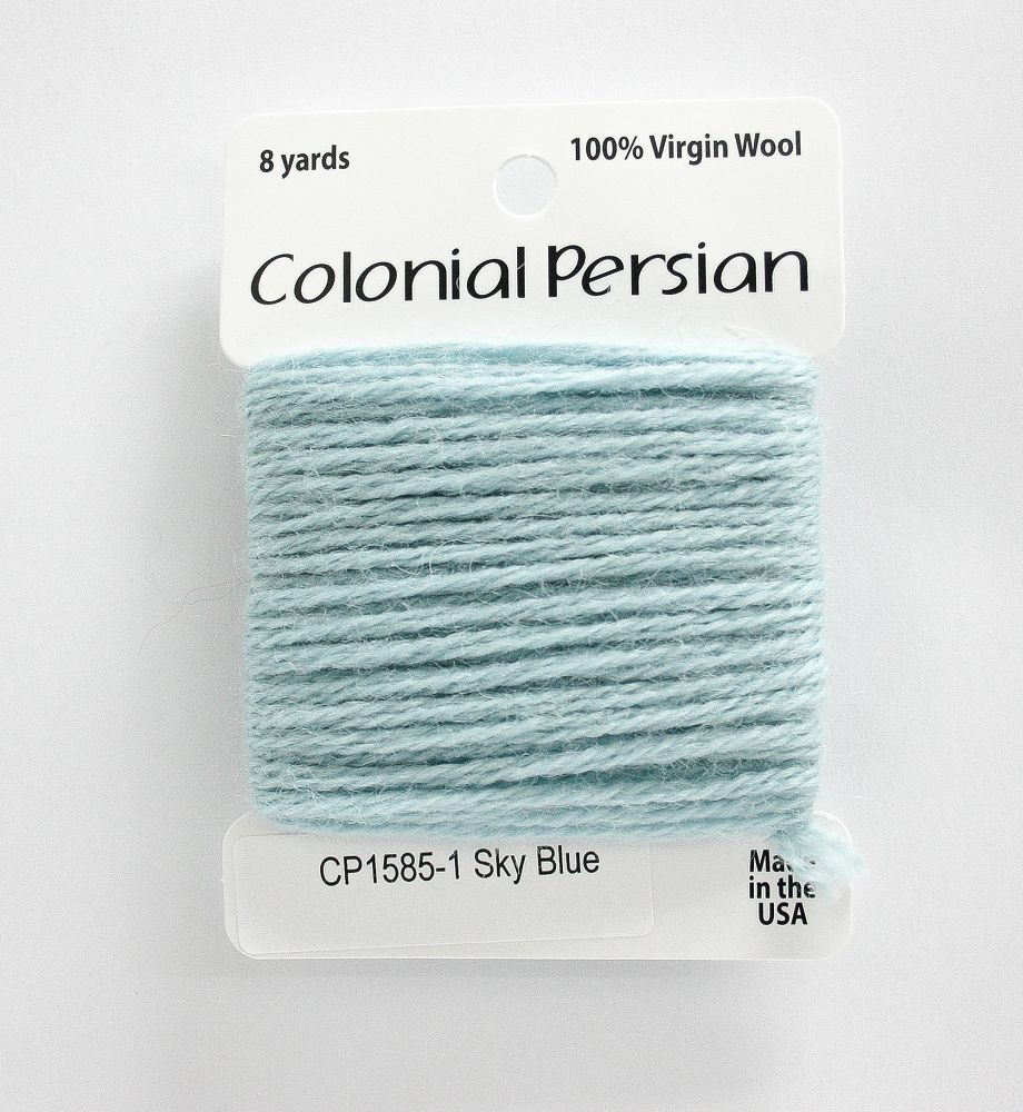 This is Colonial Persian from Colonial Needle Co in color Sky Blue. A traditional needlepoint fiber. Comparable to the now-discontinued Paternayan wool. Use all three strands on 10 mesh, 2 strands on 13 mesh, 1 strand on 18 mesh. 1 strand is about equivilant to 1 strand of crewel wool.