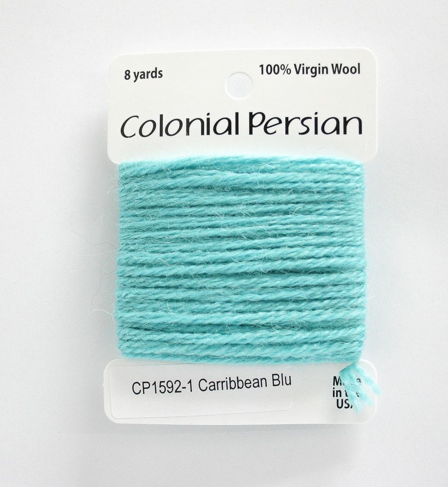 This is Colonial Persian from Colonial Needle Co in color Caribbean Blue. A traditional needlepoint fiber. Comparable to the now-discontinued Paternayan wool. Use all three strands on 10 mesh, 2 strands on 13 mesh, 1 strand on 18 mesh. 1 strand is about equivilant to 1 strand of crewel wool.