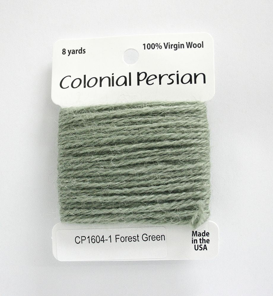 This is Colonial Persian from Colonial Needle Co in color Forest Green. A traditional needlepoint fiber. Comparable to the now-discontinued Paternayan wool. Use all three strands on 10 mesh, 2 strands on 13 mesh, 1 strand on 18 mesh. 1 strand is about equivilant to 1 strand of crewel wool.