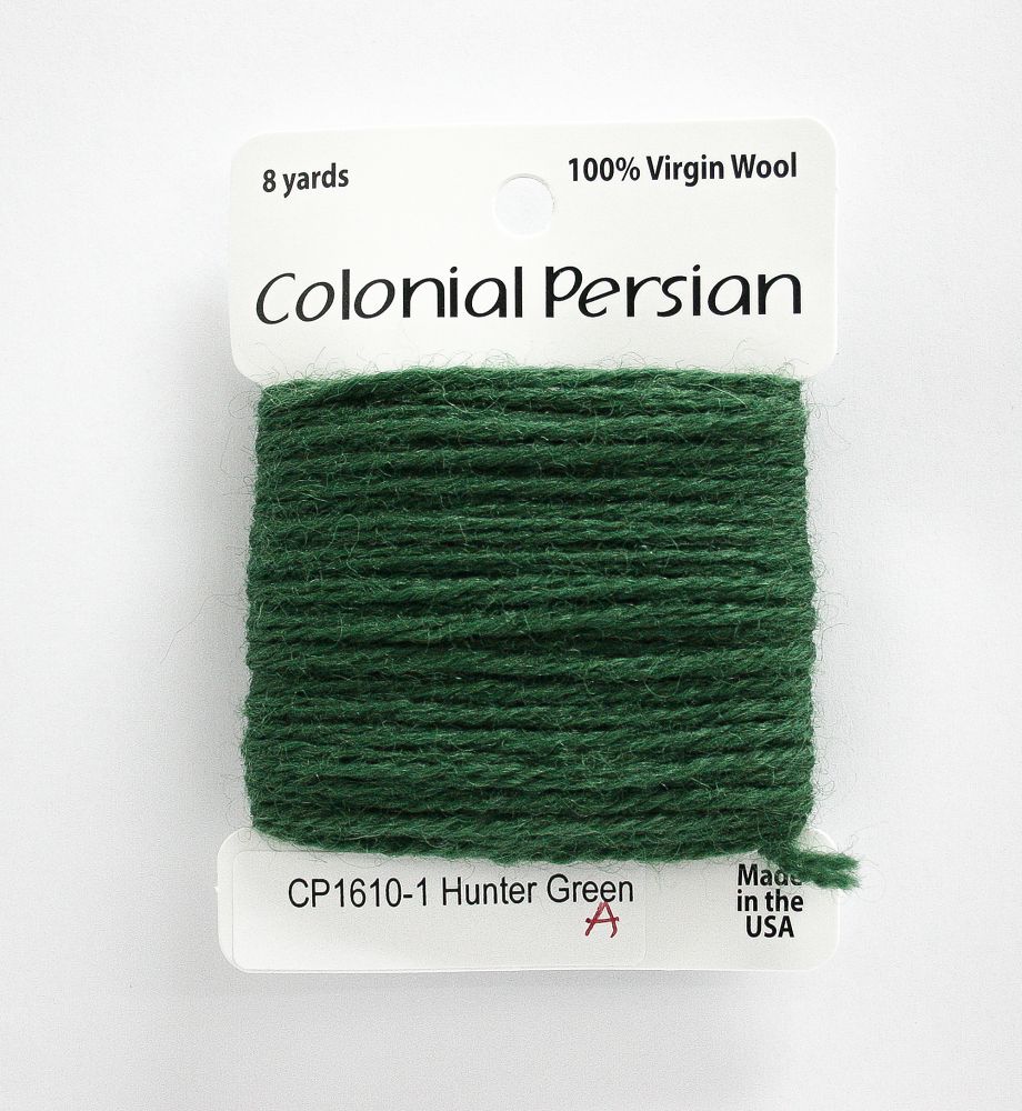 This is Colonial Persian from Colonial Needle Co in color Hunter Green. A traditional needlepoint fiber. Comparable to the now-discontinued Paternayan wool. Use all three strands on 10 mesh, 2 strands on 13 mesh, 1 strand on 18 mesh. 1 strand is about equivilant to 1 strand of crewel wool.