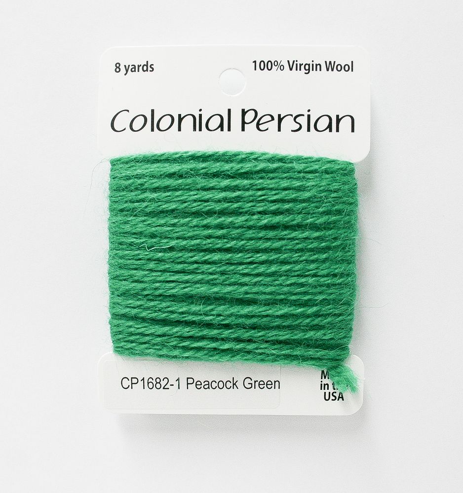 This is Colonial Persian from Colonial Needle Co in color Peacock Green. A traditional needlepoint fiber. Comparable to the now-discontinued Paternayan wool. Use all three strands on 10 mesh, 2 strands on 13 mesh, 1 strand on 18 mesh. 1 strand is about equivilant to 1 strand of crewel wool.
