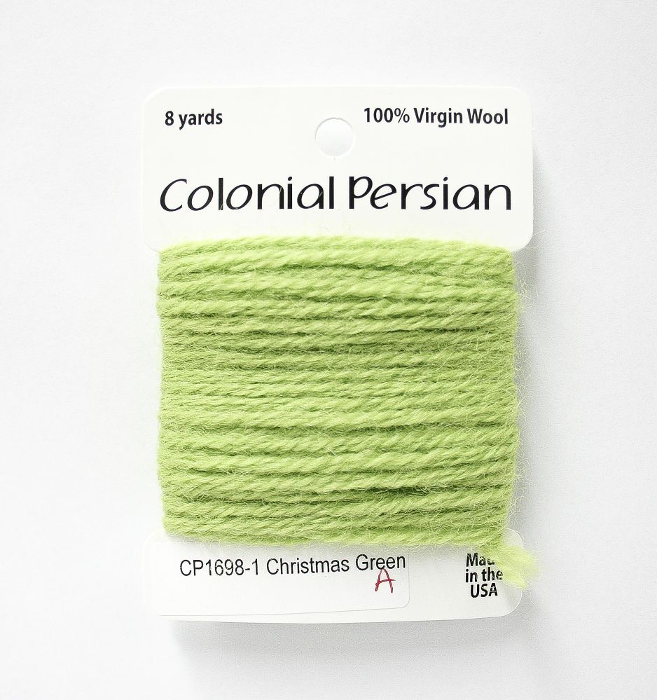 This is Colonial Persian from Colonial Needle Co in color Christmas Green. A traditional needlepoint fiber. Comparable to the now-discontinued Paternayan wool. Use all three strands on 10 mesh, 2 strands on 13 mesh, 1 strand on 18 mesh. 1 strand is about equivilant to 1 strand of crewel wool.