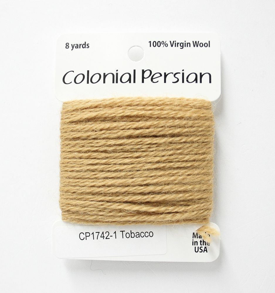 This is Colonial Persian from Colonial Needle Co in color Tobacco. A traditional needlepoint fiber. Comparable to the now-discontinued Paternayan wool. Use all three strands on 10 mesh, 2 strands on 13 mesh, 1 strand on 18 mesh. 1 strand is about equivilant to 1 strand of crewel wool.