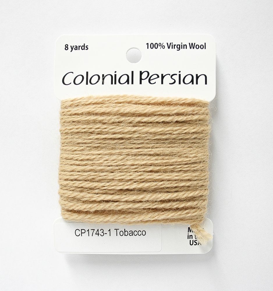 This is Colonial Persian from Colonial Needle Co in color Tobacco. A traditional needlepoint fiber. Comparable to the now-discontinued Paternayan wool. Use all three strands on 10 mesh, 2 strands on 13 mesh, 1 strand on 18 mesh. 1 strand is about equivilant to 1 strand of crewel wool.