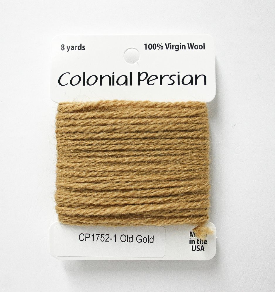 This is Colonial Persian from Colonial Needle Co in color Old Gold. A traditional needlepoint fiber. Comparable to the now-discontinued Paternayan wool. Use all three strands on 10 mesh, 2 strands on 13 mesh, 1 strand on 18 mesh. 1 strand is about equivilant to 1 strand of crewel wool.