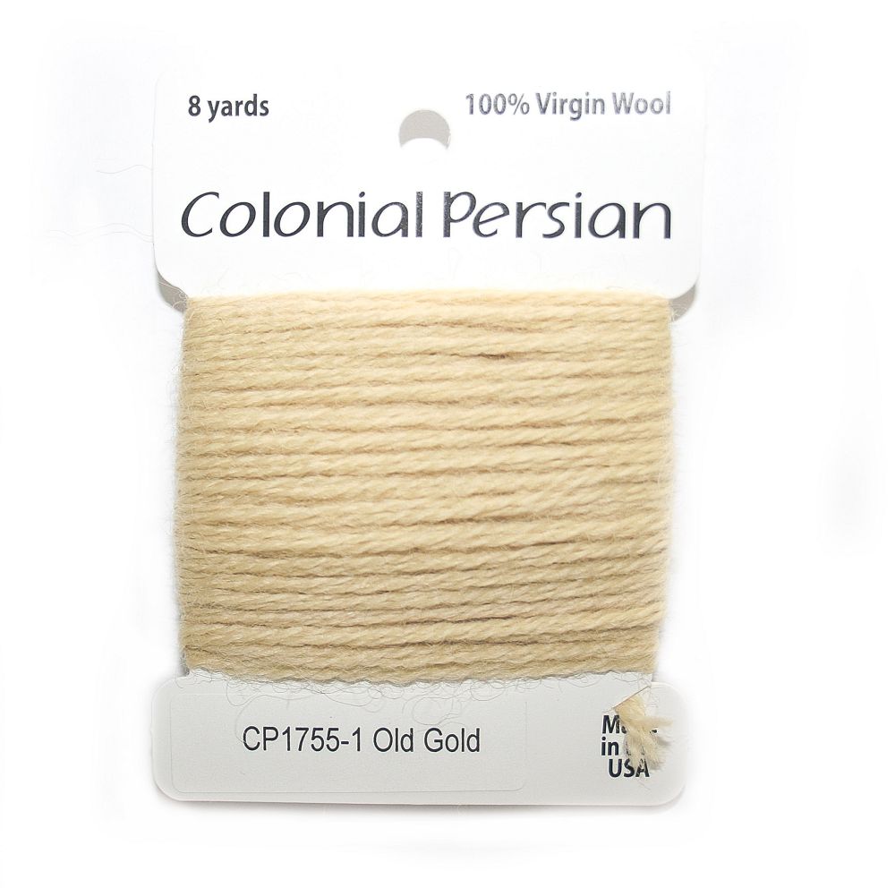 This is Colonial Persian from Colonial Needle Co in color Old Gold. A traditional needlepoint fiber. Comparable to the now-discontinued Paternayan wool. Use all three strands on 10 mesh, 2 strands on 13 mesh, 1 strand on 18 mesh. 1 strand is about equivilant to 1 strand of crewel wool.