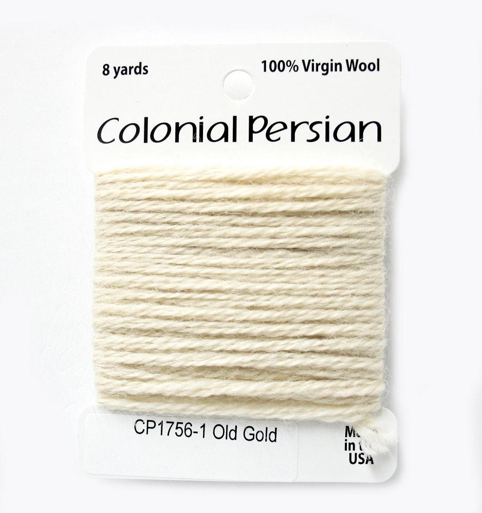 This is Colonial Persian from Colonial Needle Co in color Old Gold. A traditional needlepoint fiber. Comparable to the now-discontinued Paternayan wool. Use all three strands on 10 mesh, 2 strands on 13 mesh, 1 strand on 18 mesh. 1 strand is about equivilant to 1 strand of crewel wool.