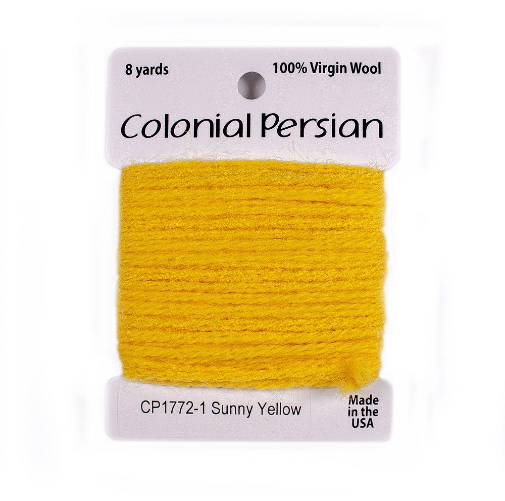 This is Colonial Persian from Colonial Needle Co in color Sunny Yellow. A traditional needlepoint fiber. Comparable to the now-discontinued Paternayan wool. Use all three strands on 10 mesh, 2 strands on 13 mesh, 1 strand on 18 mesh. 1 strand is about equivilant to 1 strand of crewel wool.