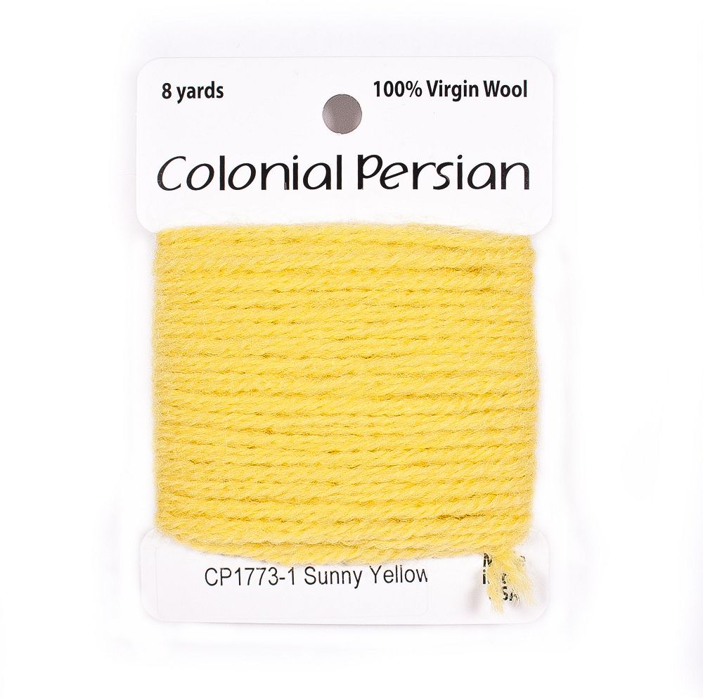 This is Colonial Persian from Colonial Needle Co in color Sunny Yellow. A traditional needlepoint fiber. Comparable to the now-discontinued Paternayan wool. Use all three strands on 10 mesh, 2 strands on 13 mesh, 1 strand on 18 mesh. 1 strand is about equivilant to 1 strand of crewel wool.