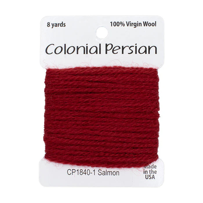 This is Colonial Persian from Colonial Needle Co in color Salmon. A traditional needlepoint fiber. Comparable to the now-discontinued Paternayan wool. Use all three strands on 10 mesh, 2 strands on 13 mesh, 1 strand on 18 mesh. 1 strand is about equivilant to 1 strand of crewel wool.