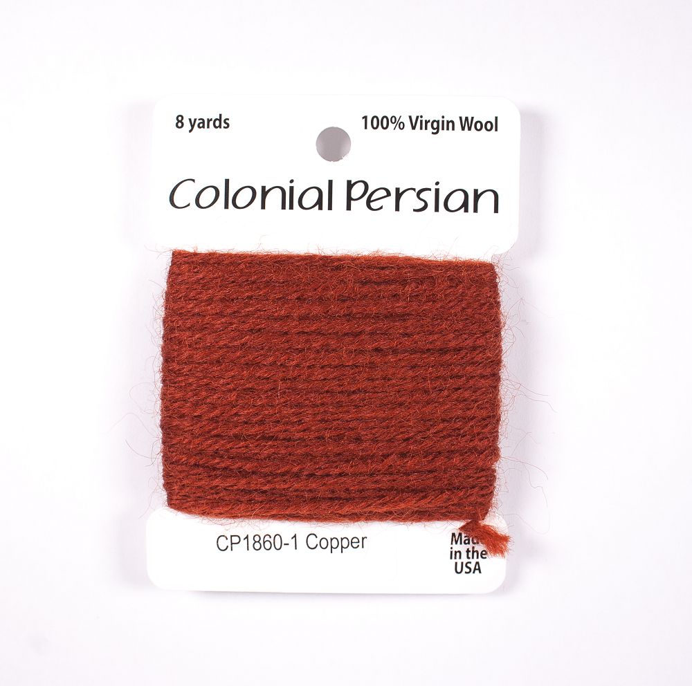 This is Colonial Persian from Colonial Needle Co in color Copper. A traditional needlepoint fiber. Comparable to the now-discontinued Paternayan wool. Use all three strands on 10 mesh, 2 strands on 13 mesh, 1 strand on 18 mesh. 1 strand is about equivilant to 1 strand of crewel wool.