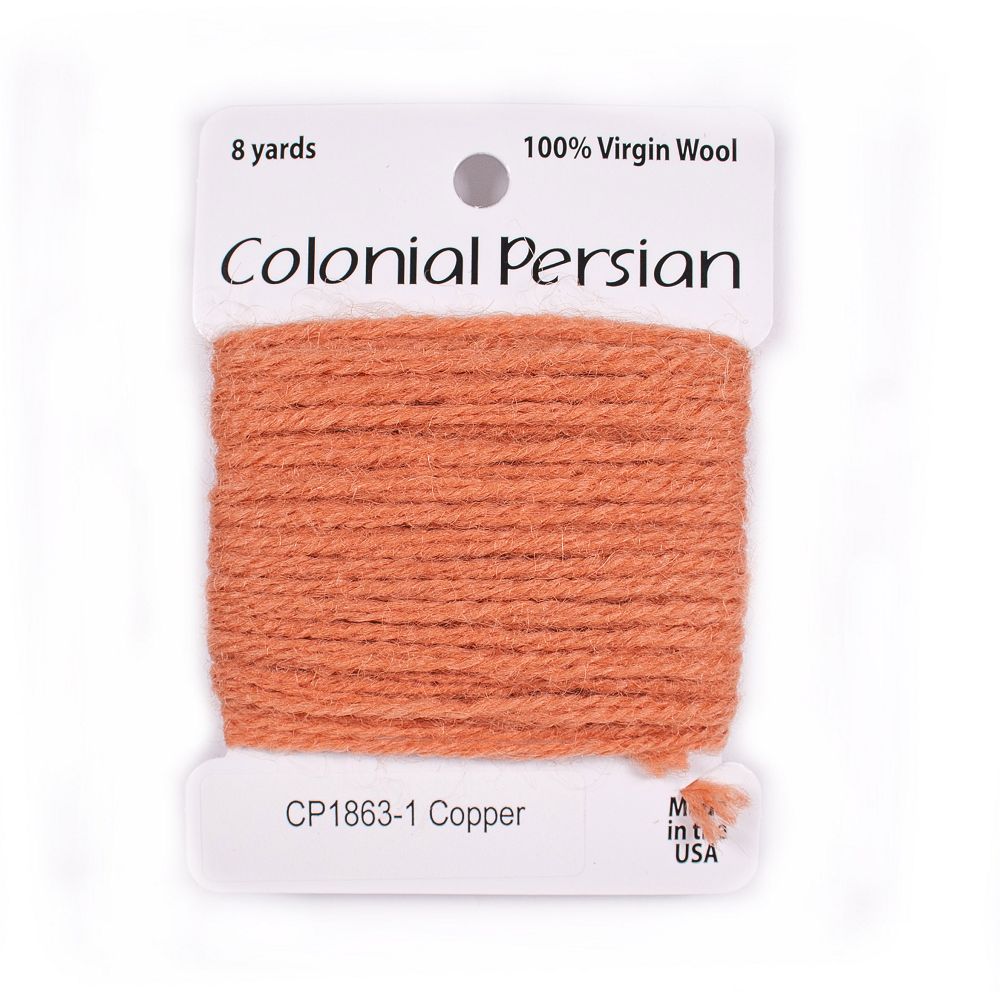 This is Colonial Persian from Colonial Needle Co in color Copper. A traditional needlepoint fiber. Comparable to the now-discontinued Paternayan wool. Use all three strands on 10 mesh, 2 strands on 13 mesh, 1 strand on 18 mesh. 1 strand is about equivilant to 1 strand of crewel wool.