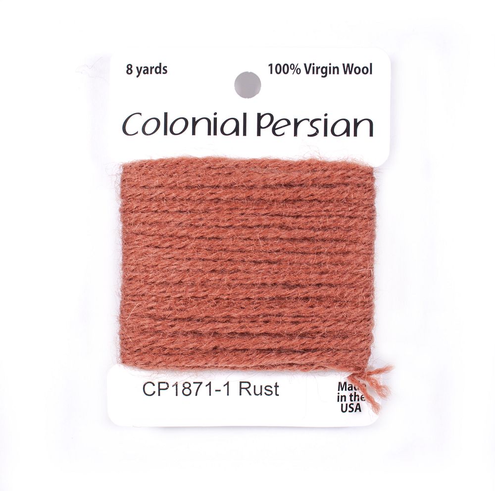 This is Colonial Persian from Colonial Needle Co in color Rust. A traditional needlepoint fiber. Comparable to the now-discontinued Paternayan wool. Use all three strands on 10 mesh, 2 strands on 13 mesh, 1 strand on 18 mesh. 1 strand is about equivilant to 1 strand of crewel wool.