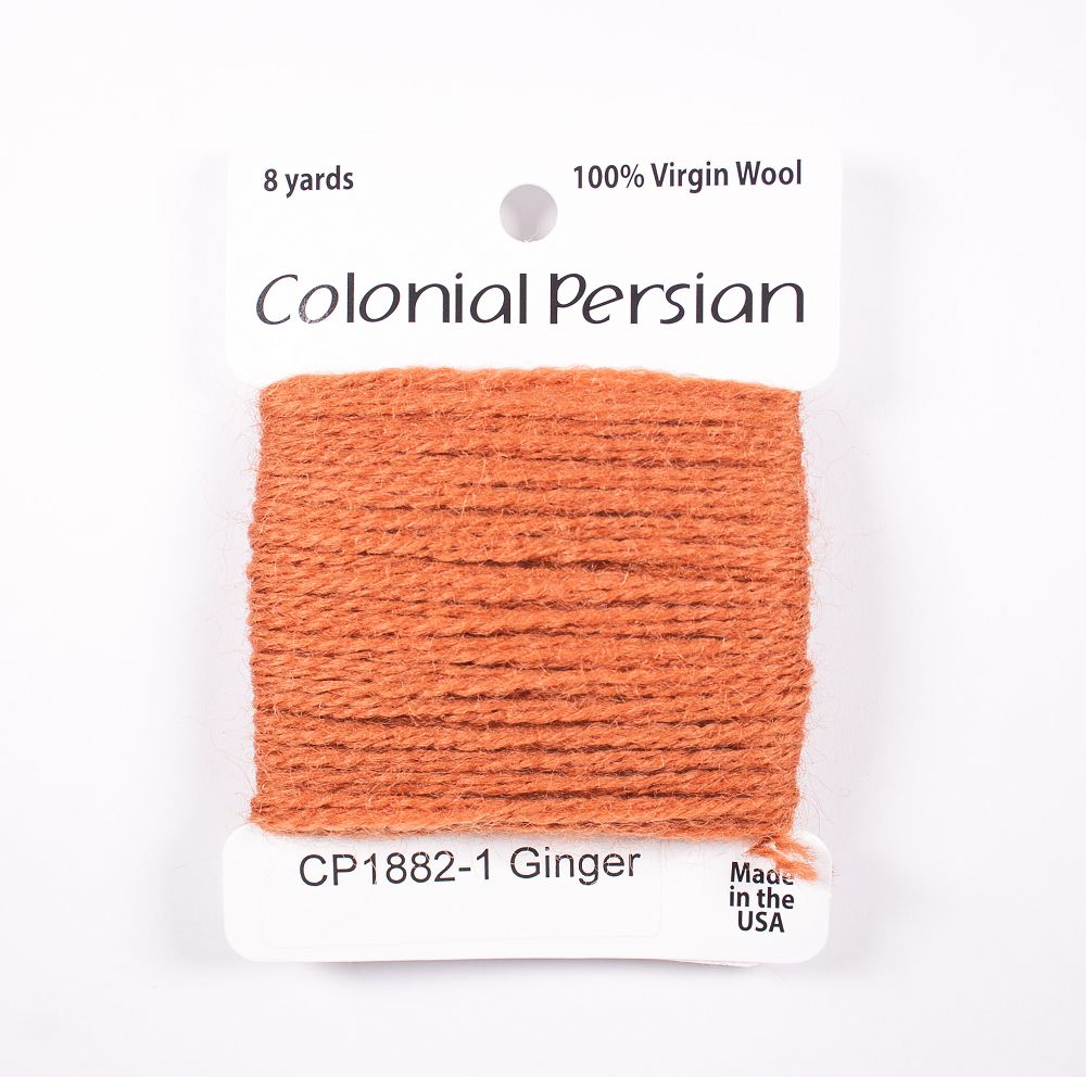 This is Colonial Persian from Colonial Needle Co in color Ginger. A traditional needlepoint fiber. Comparable to the now-discontinued Paternayan wool. Use all three strands on 10 mesh, 2 strands on 13 mesh, 1 strand on 18 mesh. 1 strand is about equivilant to 1 strand of crewel wool.