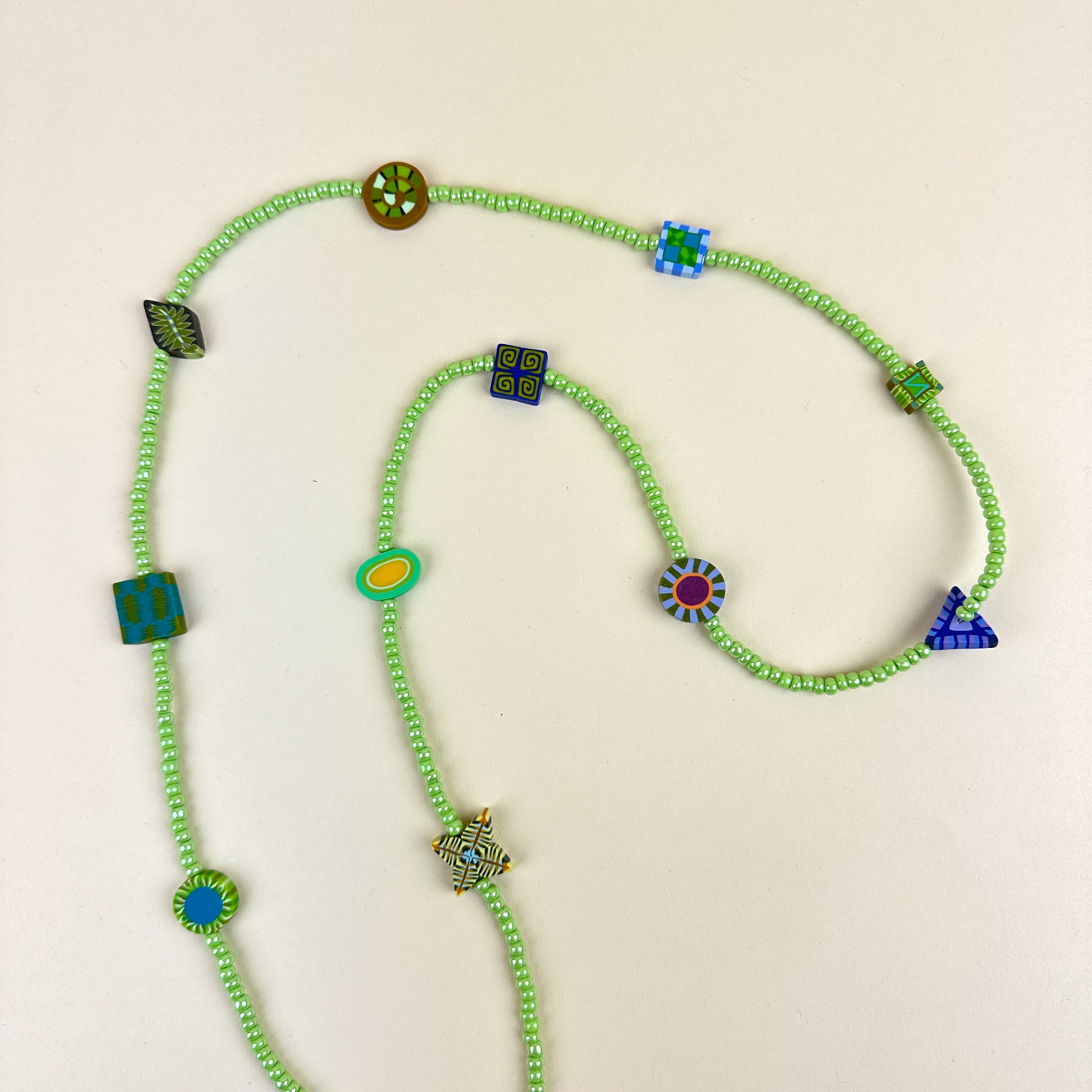 This beaded chatelaine fob necklace features glass and handmade polymer clay beads. It has a clip and small jump ring to hang your stitching tools on to keep them handy.