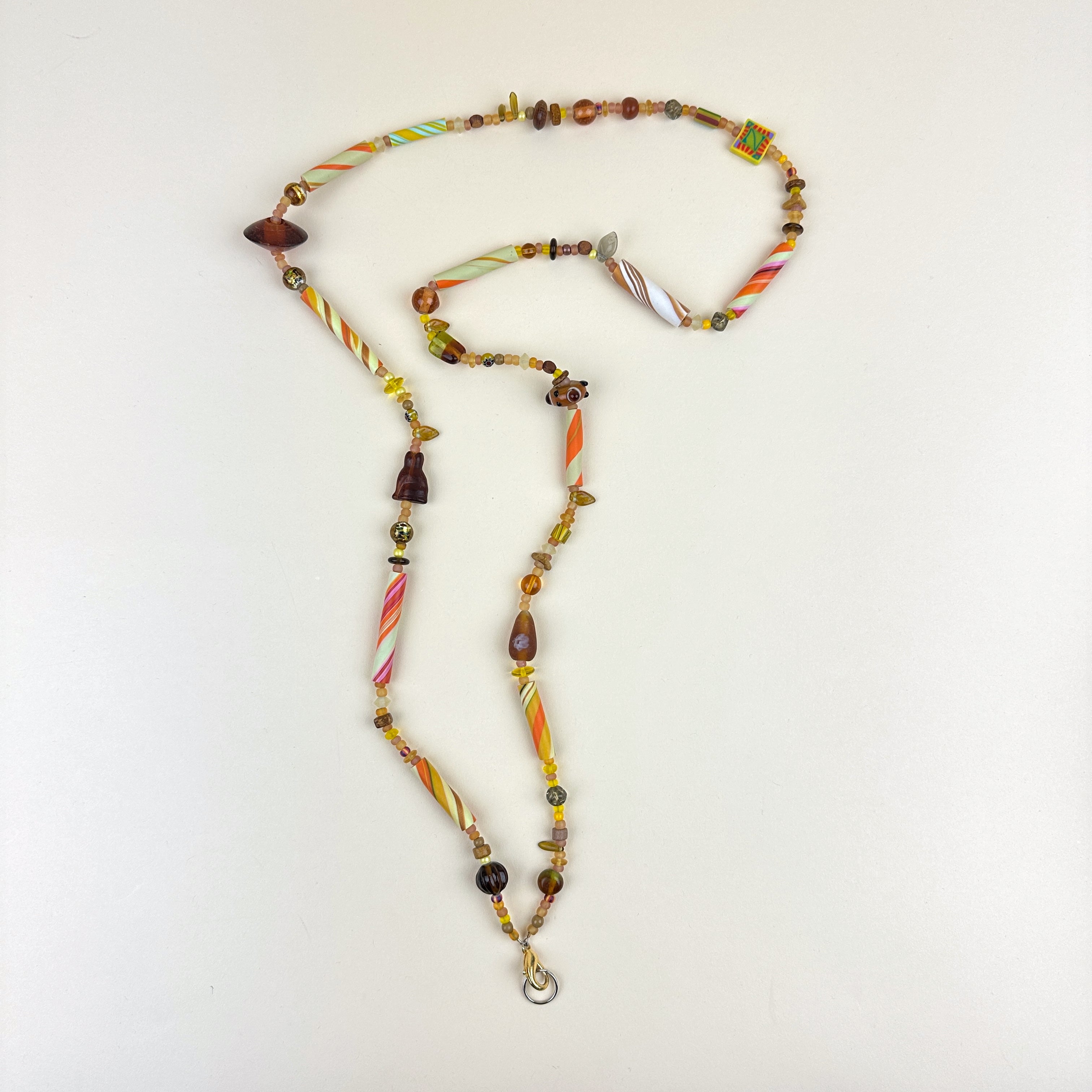This beaded chatelaine fob necklace features handmade lampwork glass beads and polymer clay beads. It has a clip and small jump ring to hang your stitching tools on to keep them handy.