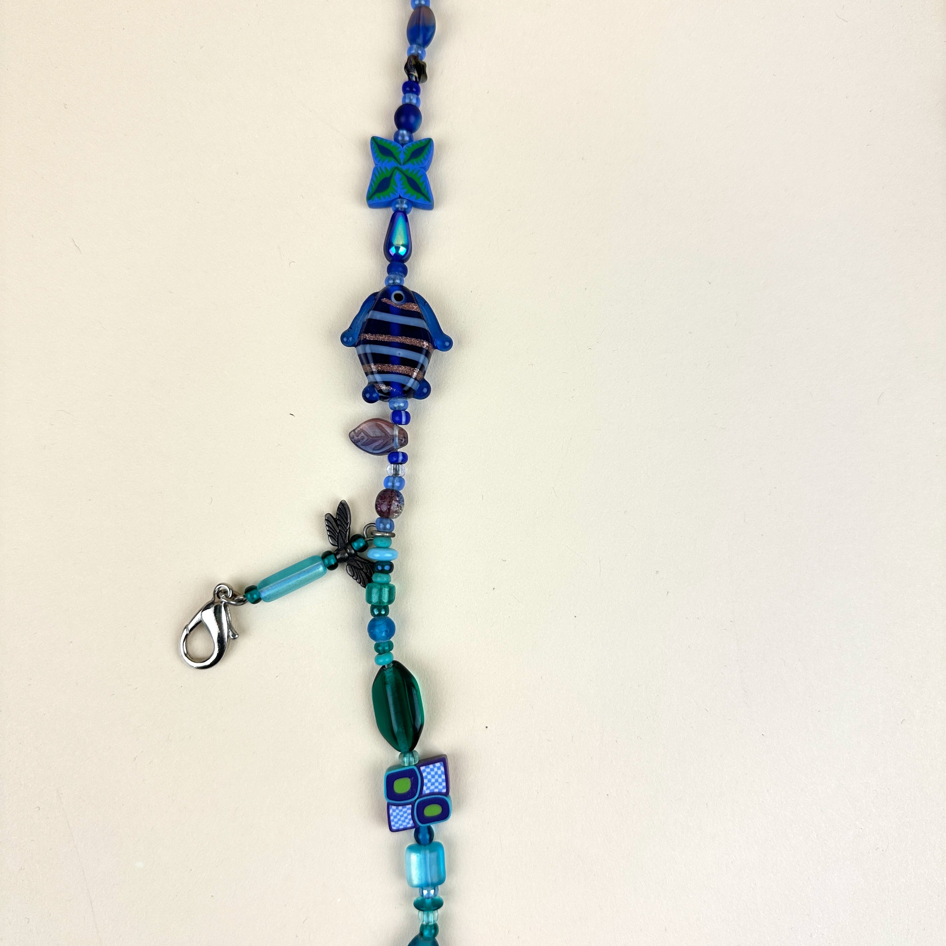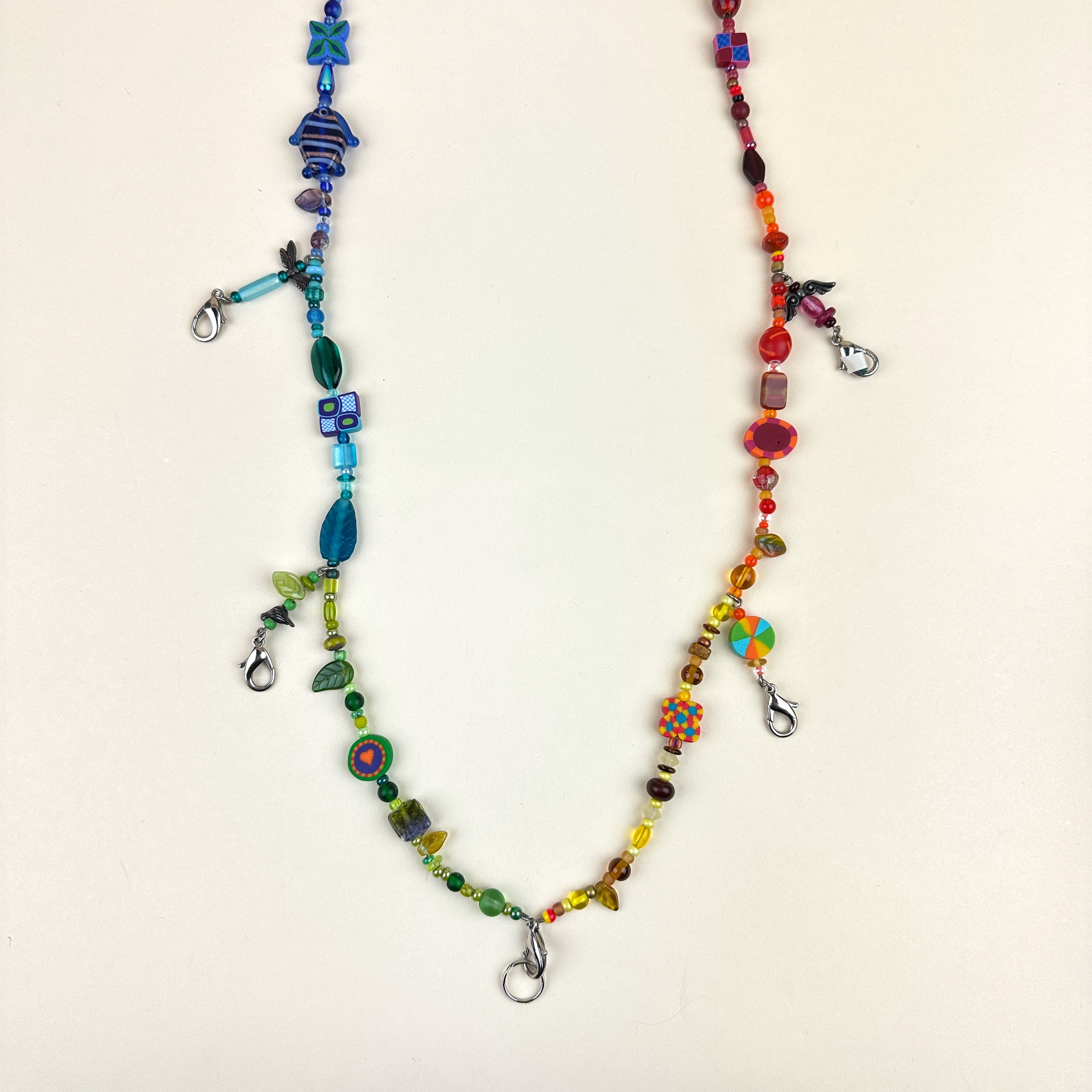 This beaded chatelaine fob necklace features handmade lampwork glass beads and polymer clay beads. It has a 5 clips to hold all your stitching tools.