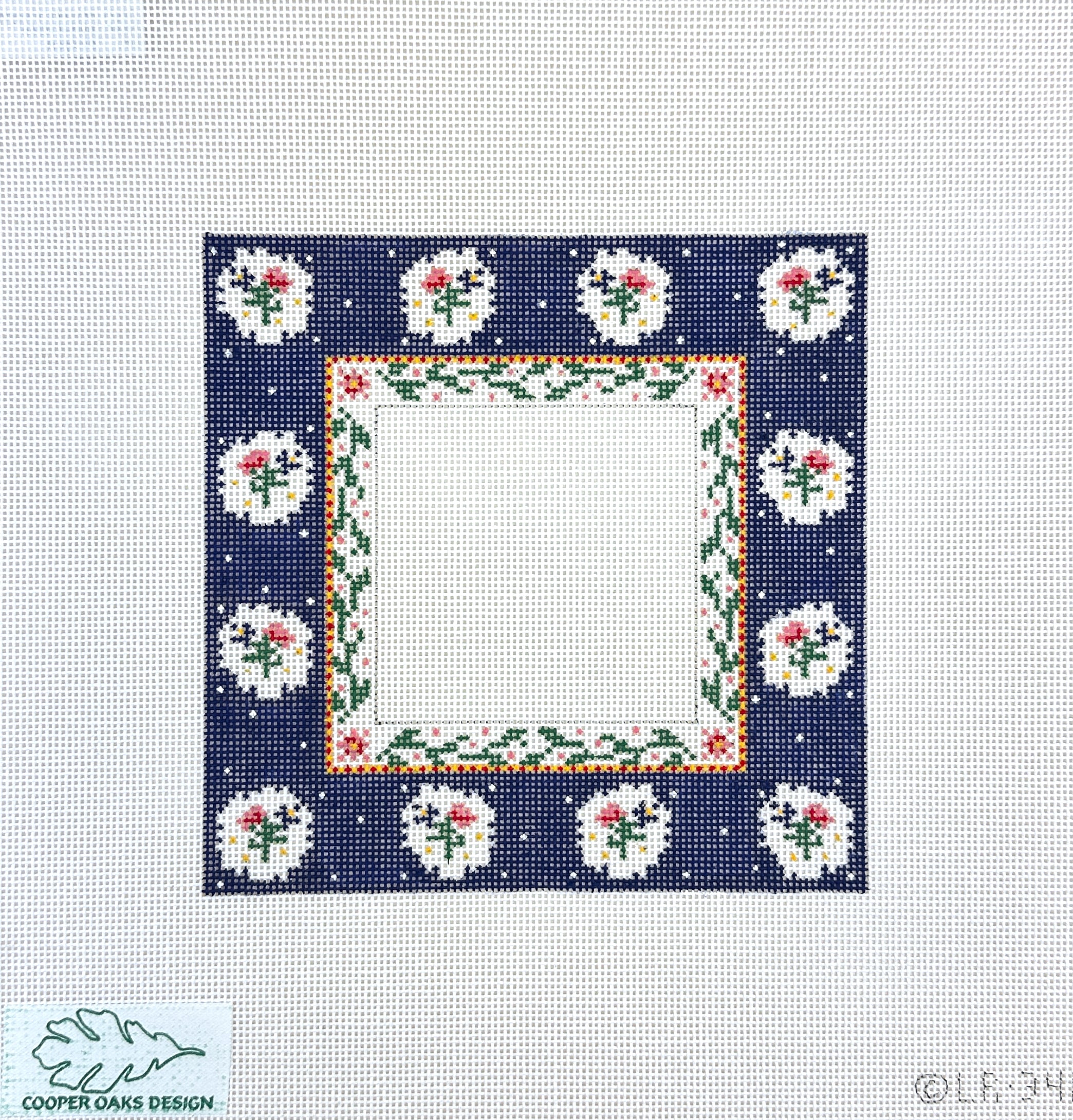 A beautiful hand painted needlepoint canvas by Linda Ragno from Cooper Oaks Design featuring a Provencal design frame in navy blue. Opening of frame is 2.75" square.
