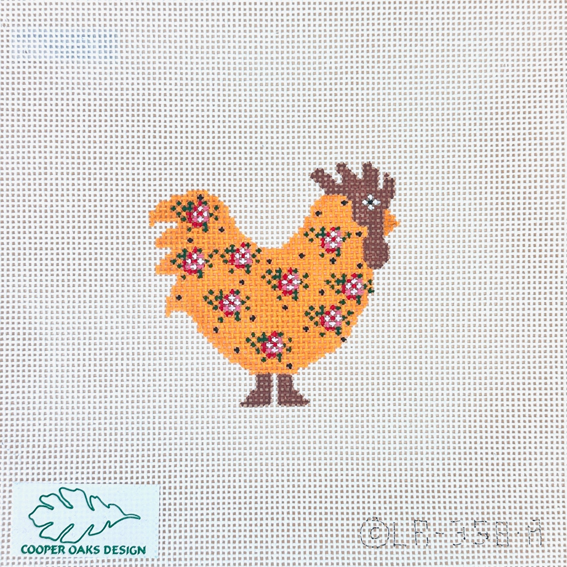 This hand painted needlepoint canvas by Linda Ragno for Cooper Oaks Design features a gold rooster with a floral pattern.