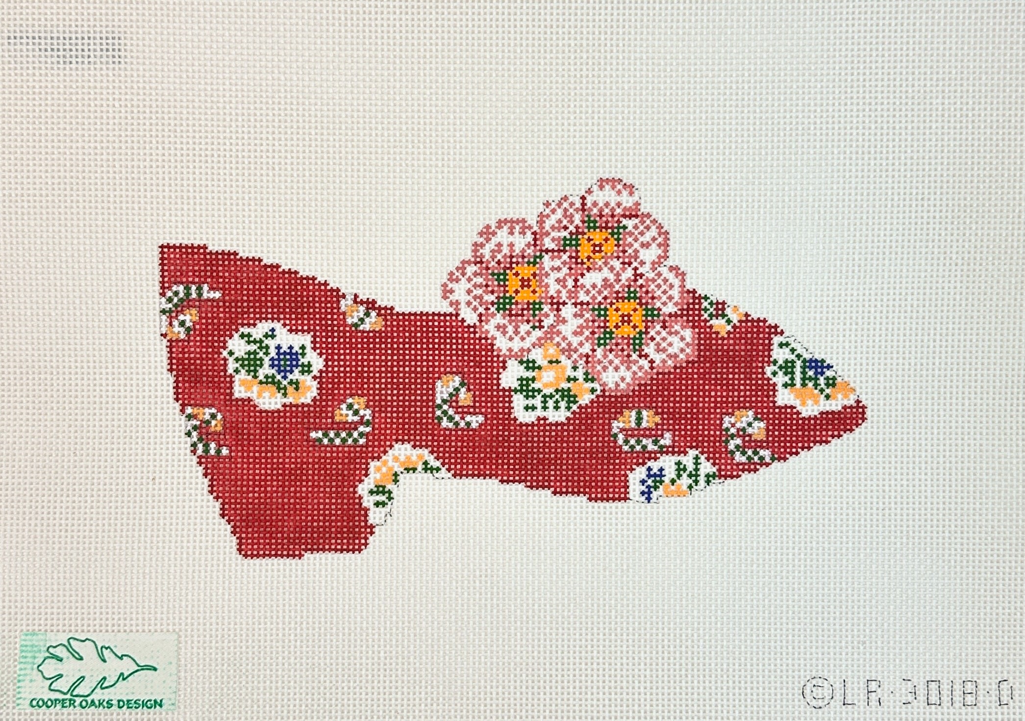 A beautiful hand painted needlepoint canvas by Linda Ragno from Cooper Oaks Design. It features a red shoe with a floral print topped with a beautiful pansy.