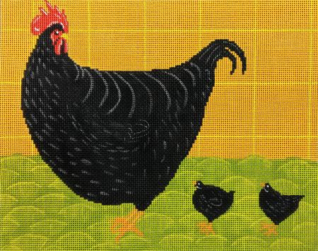 This hand painted needlepoint canvas by Warren Kimble for Cooper Oaks Design features a black hen named Dixie with a two sweet little chicks.