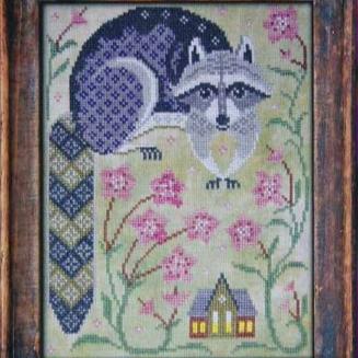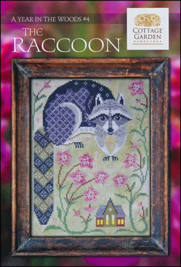 This cross stitch pattern by Cottage Garden Samplings is #4 from the A Year in the Woods series and features a cute raccoon and pink flowers.