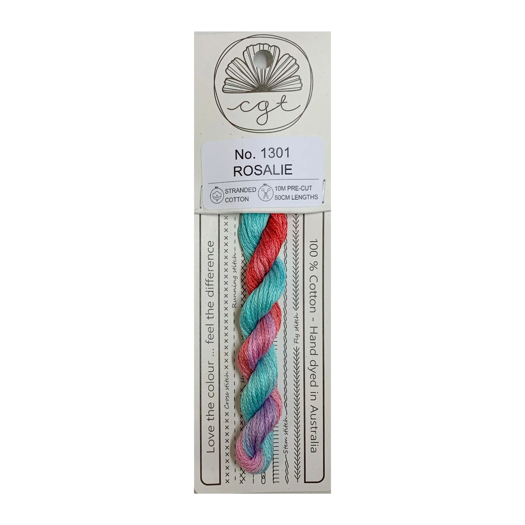 This is Signature Range from Cottage Garden Threads in color 1301 Rosalie. A vibrant palette of variegated cotton flosses, hand-dyed in Australia. Use all 6 strands on 13 mesh, 3 or 4 on 18 mesh.