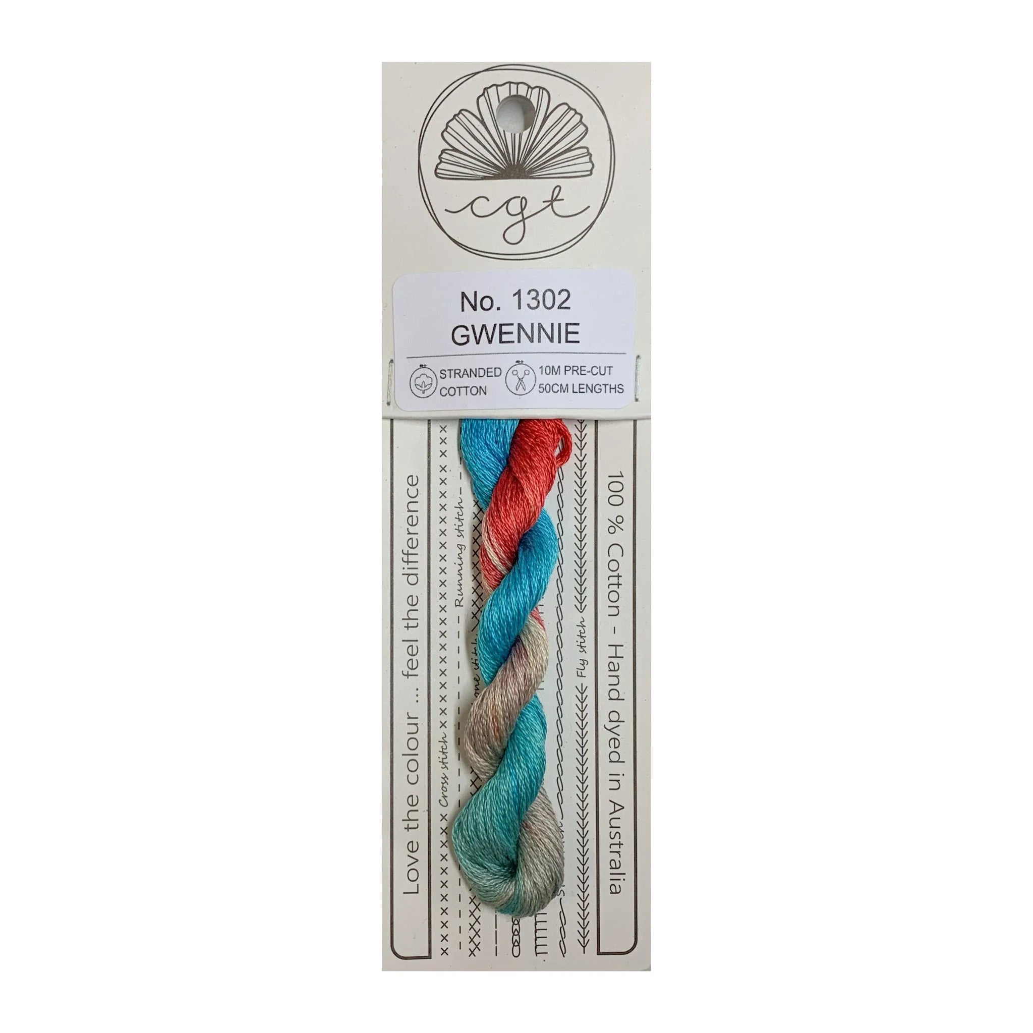 This is Signature Range from Cottage Garden Threads in color 1302 Gwennie. A vibrant palette of variegated cotton flosses, hand-dyed in Australia. Use all 6 strands on 13 mesh, 3 or 4 on 18 mesh.