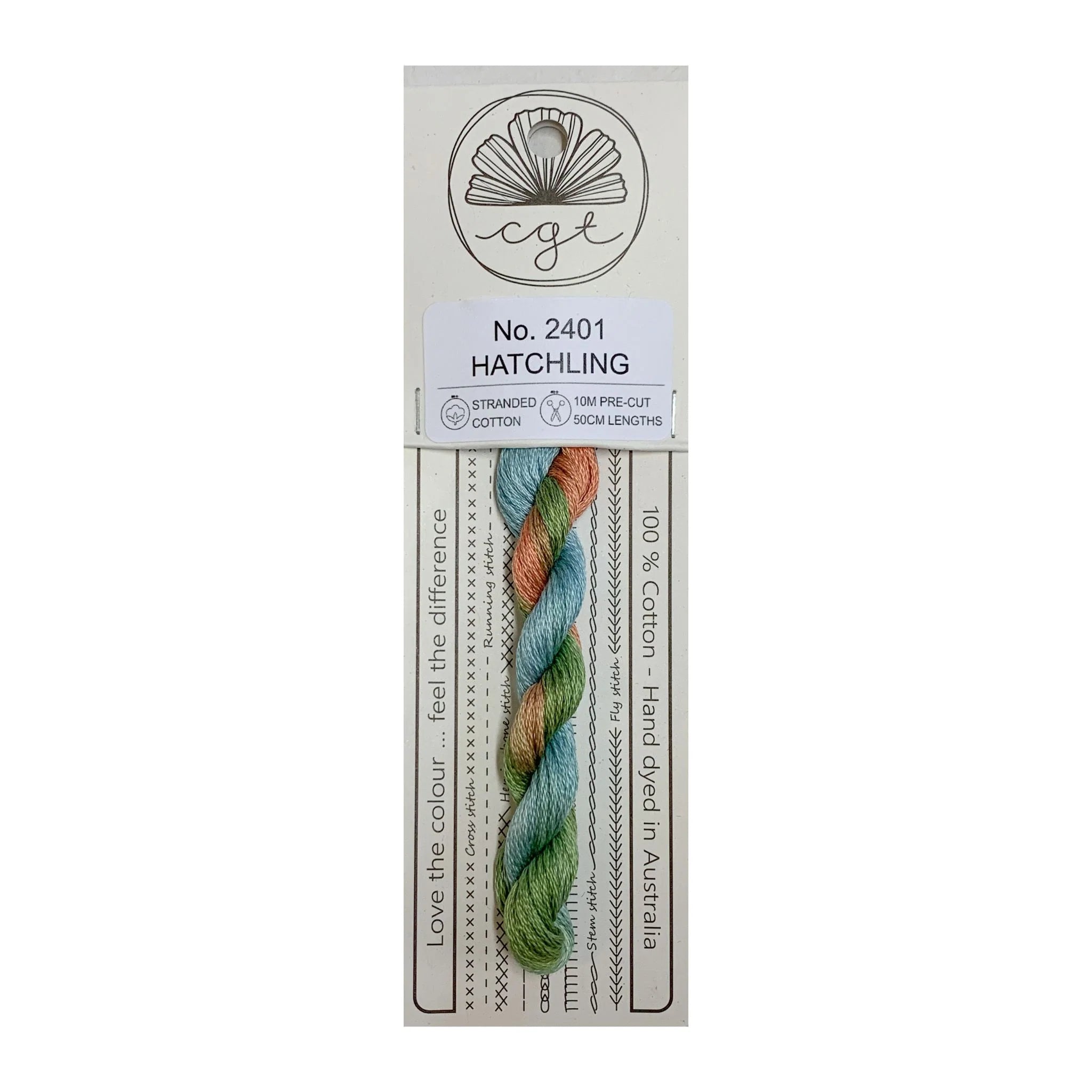 This is Signature Range from Cottage Garden Threads in color 2401 Hatchling. A vibrant palette of variegated cotton flosses, hand-dyed in Australia. Use all 6 strands on 13 mesh, 3 or 4 on 18 mesh.