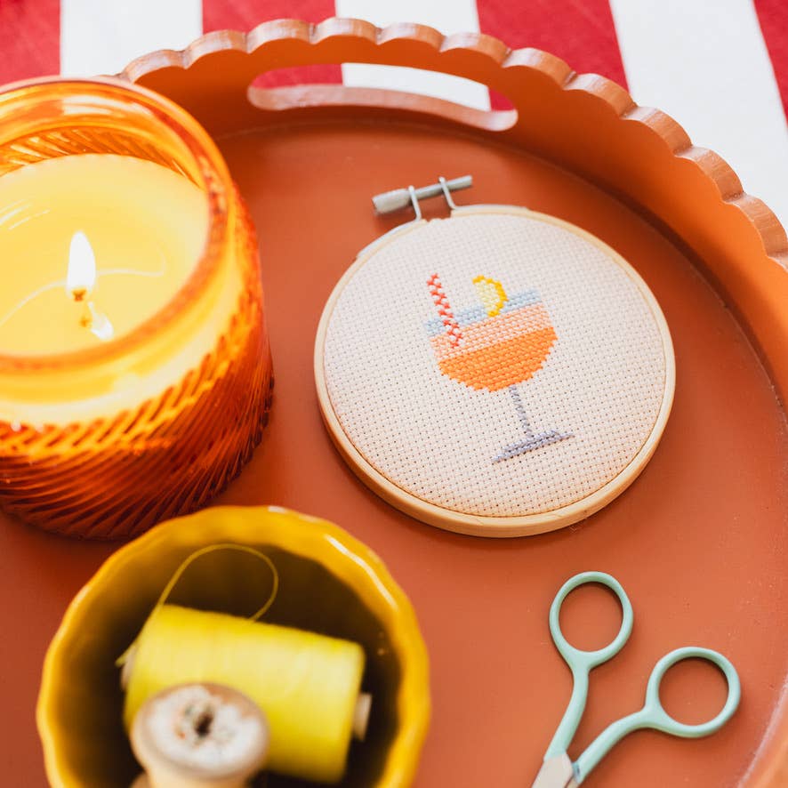 This Aperol Cocktail cross stitch kit by Cotton Clara is part of their Mini Cross Stitch Collection. The hoop measures 5" across.