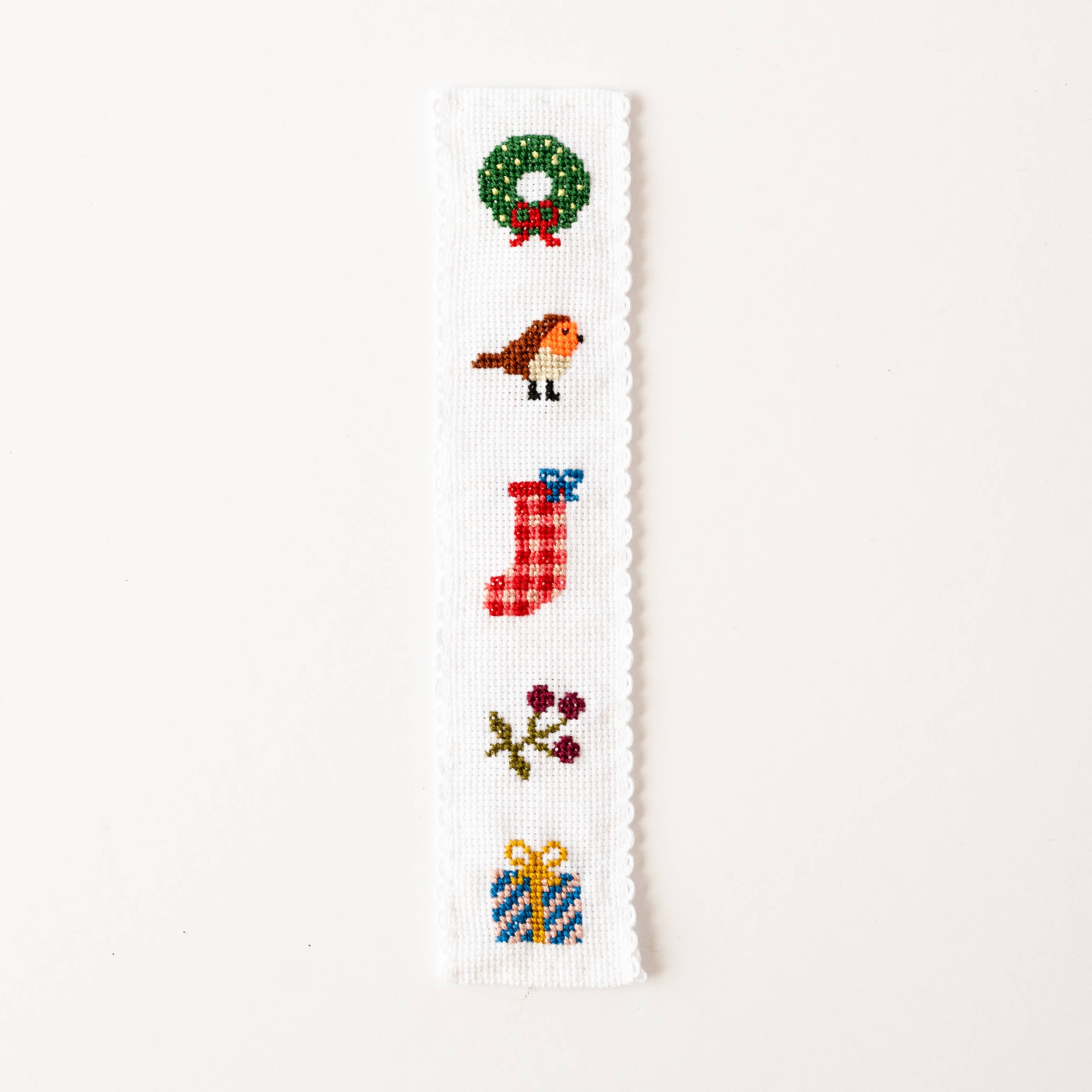 Discover the joy of cross stitching with Cotton Clara's easy-to-complete Bookmark Cross Stitch Kit. It features charming Christmas motifs. Perfect for beginners, this kit makes a wonderful starter project. It includes white aida cloth, embroidery thread, blunt tip embroidery needle, felt for backing, step-by-step instructions. Note that the fabric is not pre-printed.