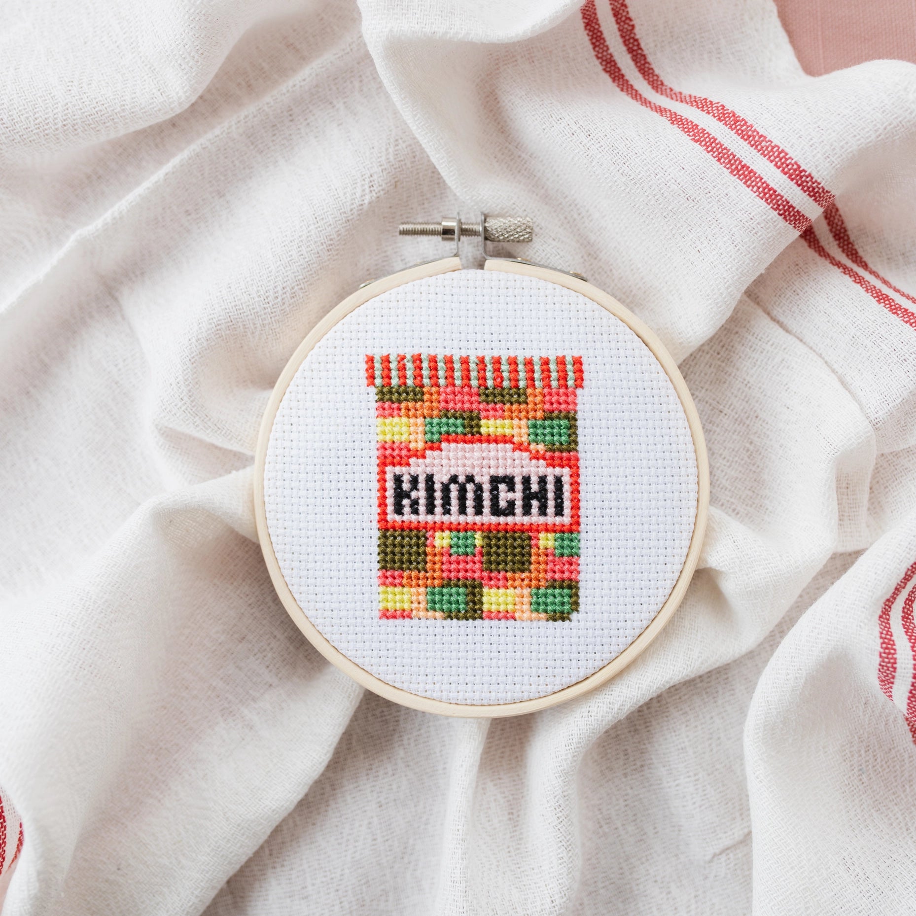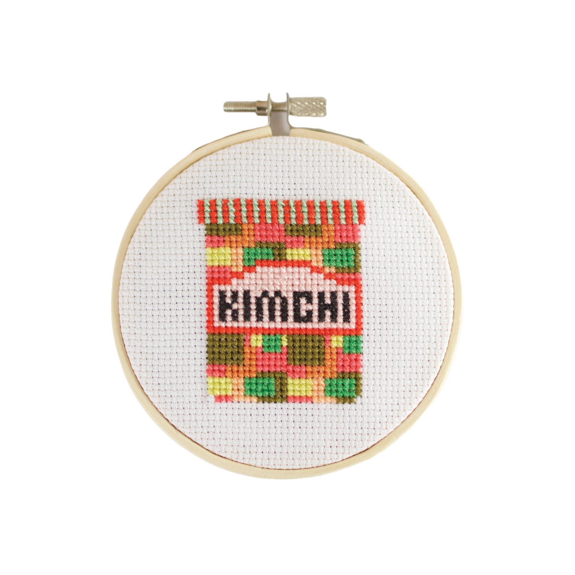 This cross stitch kit by Cotton Clara features a colorful jar of kimchi. Everything required to complete this kit is included: hoop, fabric, thread, needle, backing disc, wadding, instructions and full color cross stitch chart. This kit is suitable for beginners. Please note the fabric is not pre-printed. The packaging is fully recyclable, and contains no plastic.