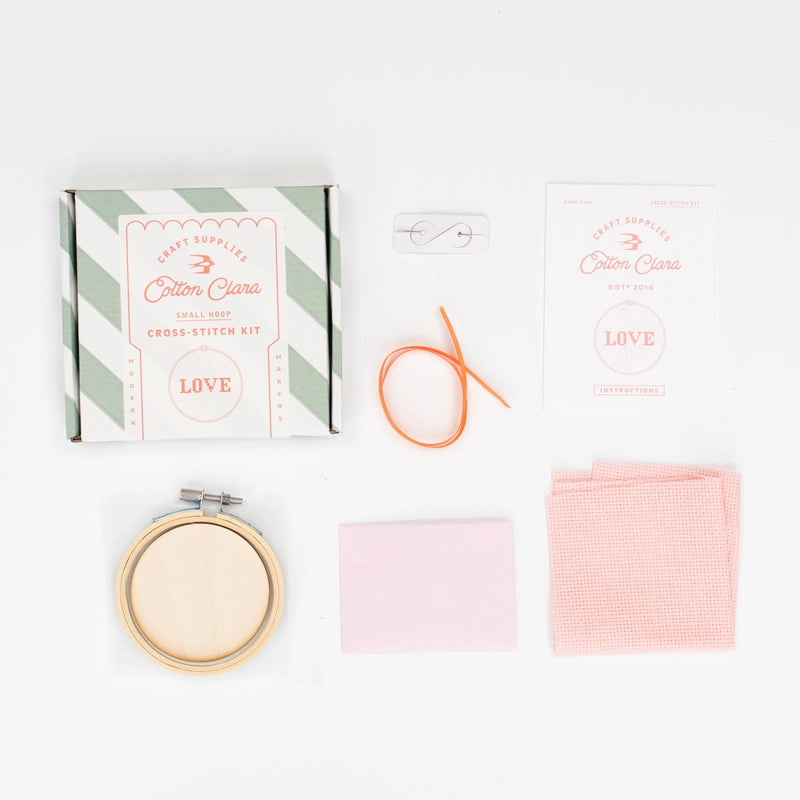 From the Leicestershire, England based brand Cotton Clara by embroidery designer Chloe Hardisty, this Love kit is part of her Slogan Cross Stitch Collection. The hoop measures about 4 1/4" across. Everything required to complete this kit is included: hoop, fabric, thread, needle, backing disc, wadding, instructions and full colour cross stitch chart. This kit is suitable for beginners. Please note the fabric is not printed in cross stitch kits. Cotton Clara's packaging is fully recyclable, and contains no plastic.