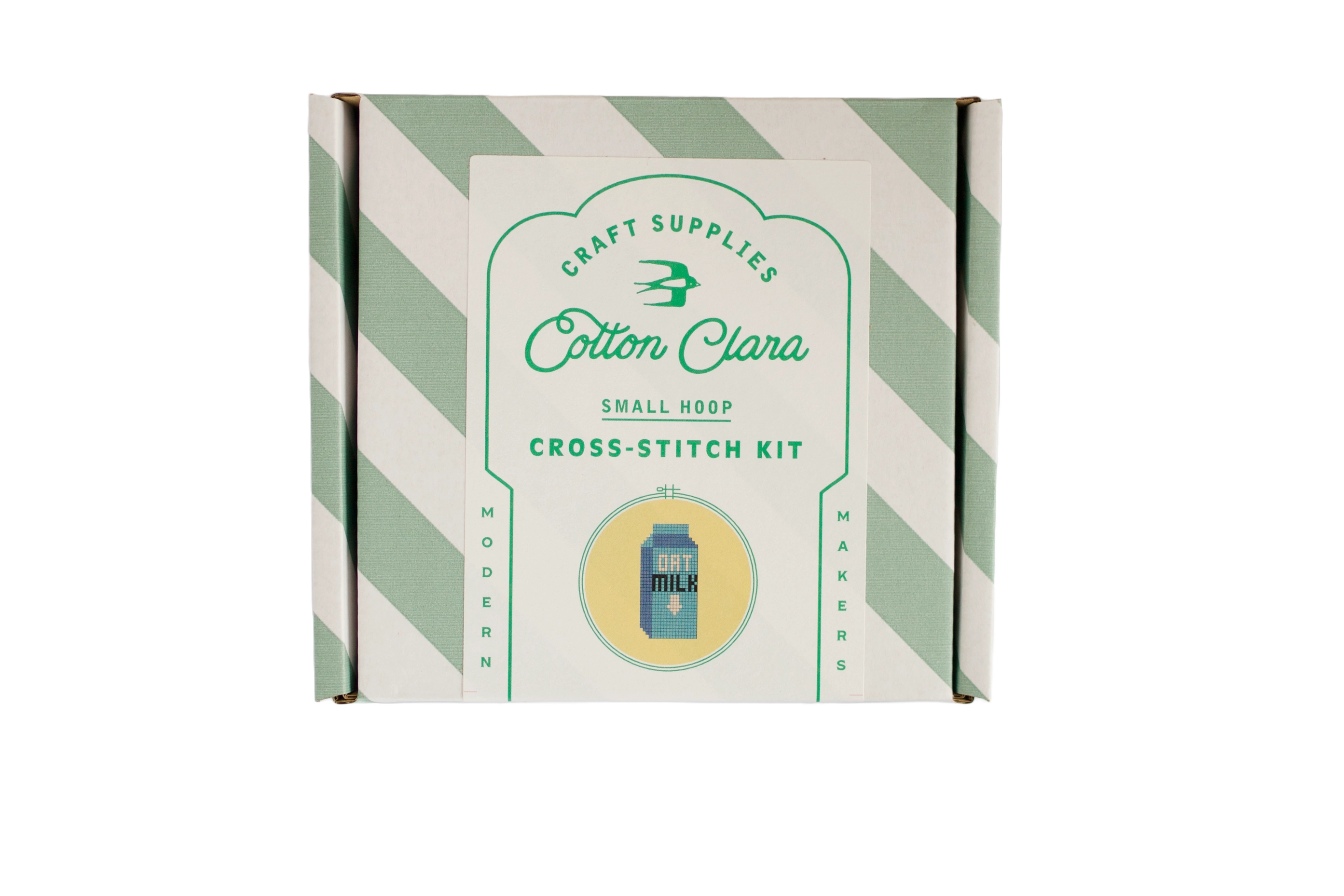 This cross stitch kit by Cotton Clara features a carton of oat milk. Everything required to complete this kit is included: hoop, fabric, thread, needle, backing disc, wadding, instructions and full color cross stitch chart. This kit is suitable for beginners. Please note the fabric is not pre-printed. The packaging is fully recyclable, and contains no plastic.