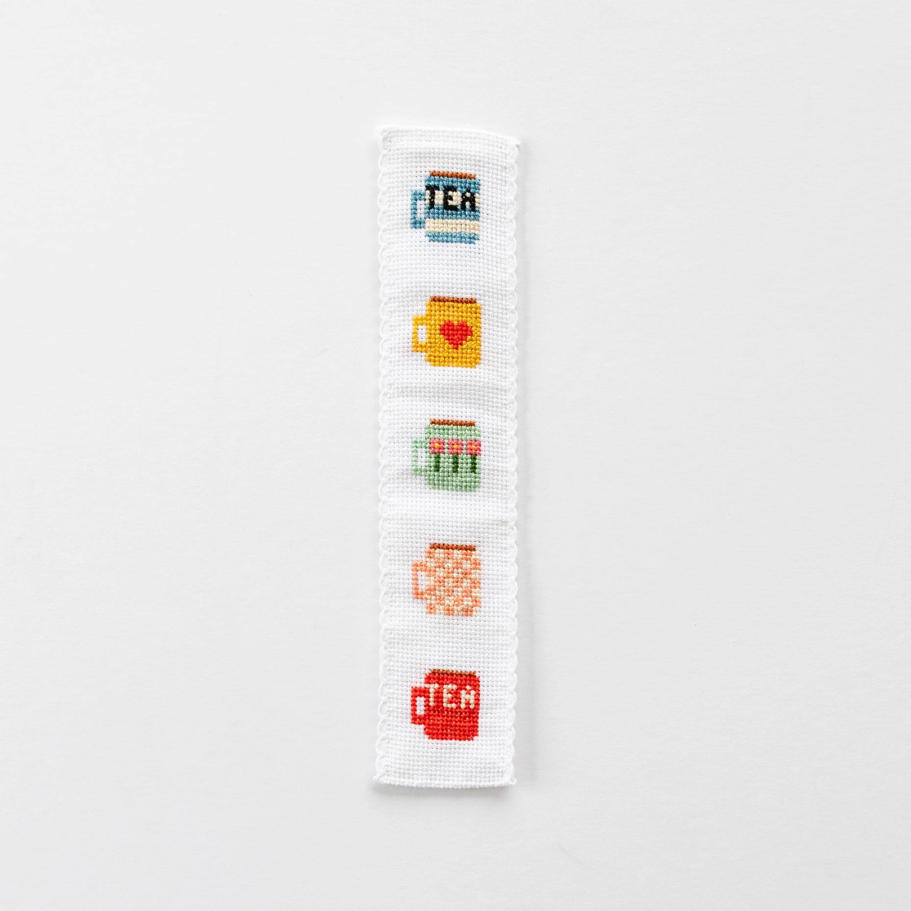 Discover the joy of cross stitching with Cotton Clara's easy-to-complete Bookmark Cross Stitch Kit. It features a stack of tea mugs. Perfect for beginners, this kit makes a wonderful starter project. It includes white aida cloth, embroidery thread, blunt tip embroidery needle, felt for backing, step-by-step instructions. Note that the fabric is not pre-printed.
