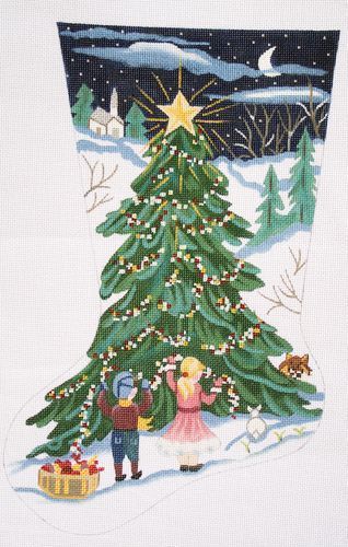 A beautiful hand painted needlepoint canvas from PLD Designs. This pretty stocking features children placing natural garland on an outdoor Christmas tree Julie Mar.