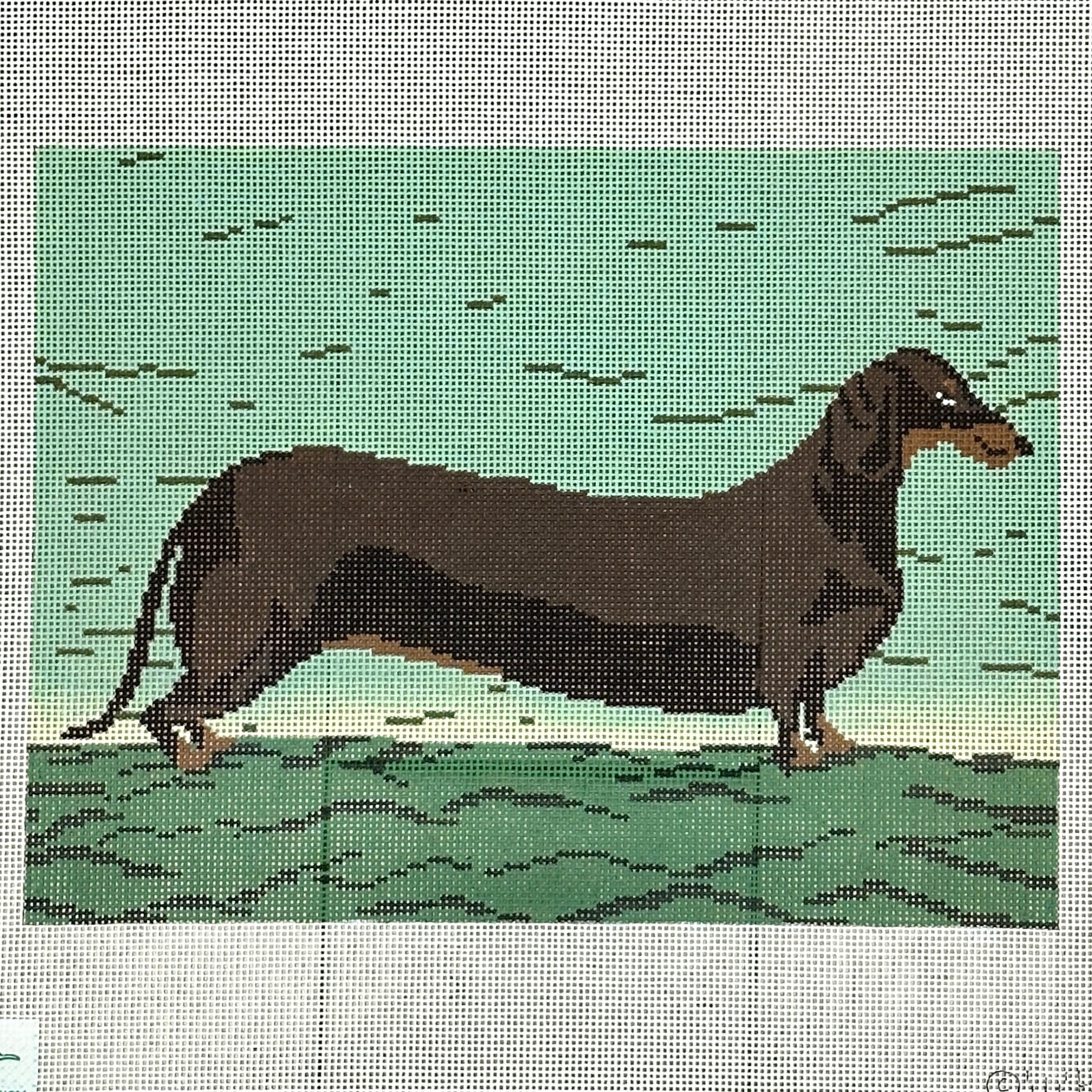 A beautiful hand painted needlepoint canvas from Cooper Oaks Design featuring a lovely dachshund named Delilah.