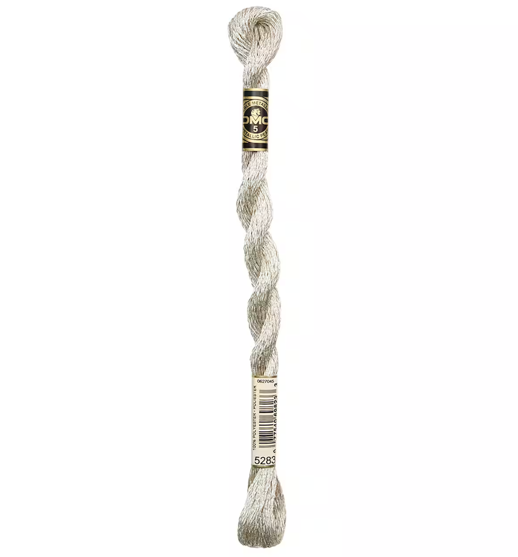 This is Pearl Cotton #5 from DMC in color 5283 Silver. A durable cotton thread, excellent for first time stitchers and experts alike! 1 ply on 18 mesh.
