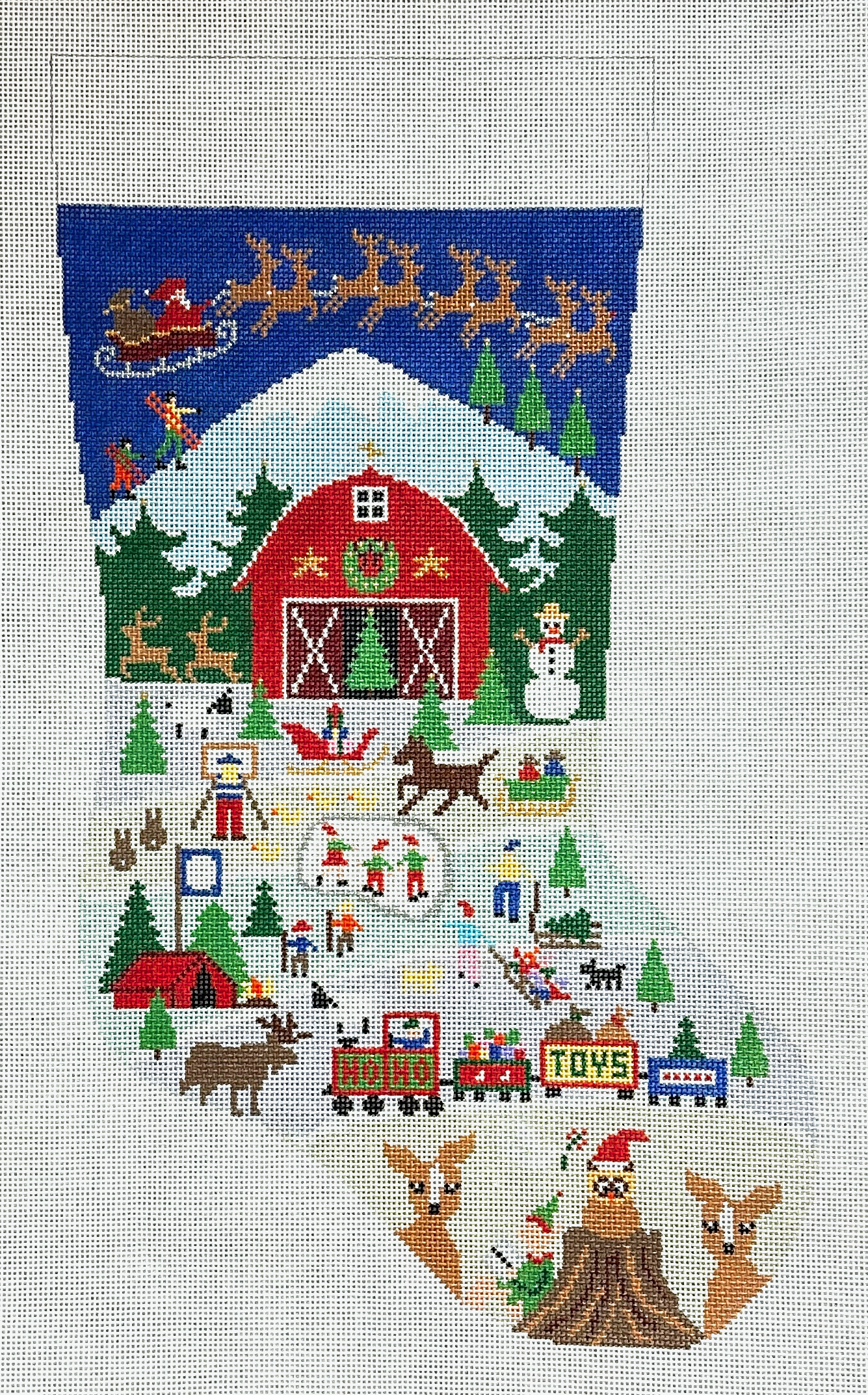 This hand painted stocking needlepoint canvas from Doolittle Stitchery features a festive barn scene with frolicking animals and people.