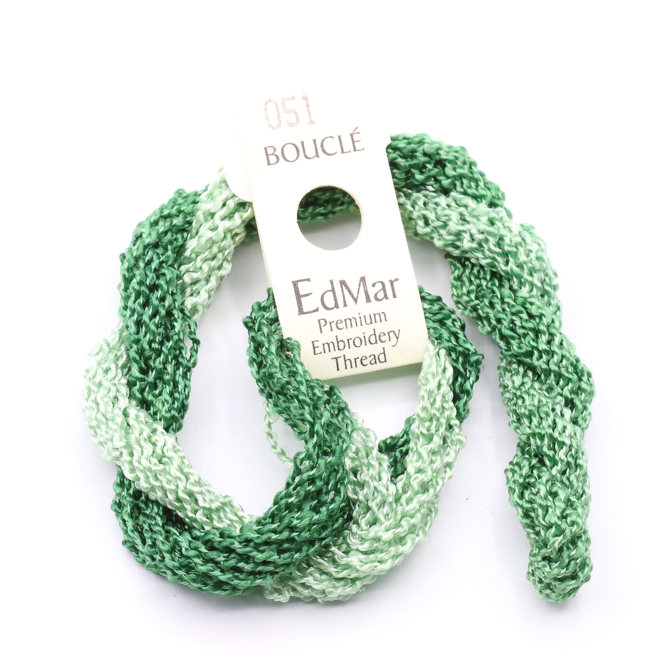 This is Boucle from EdMar in color 051 Medium to Light Lichen. 2 or 3 ply on 13 mesh, 1 ply on 18 mesh. Great for trees, clouds, water, or fur. Also try couching it for a different effect!