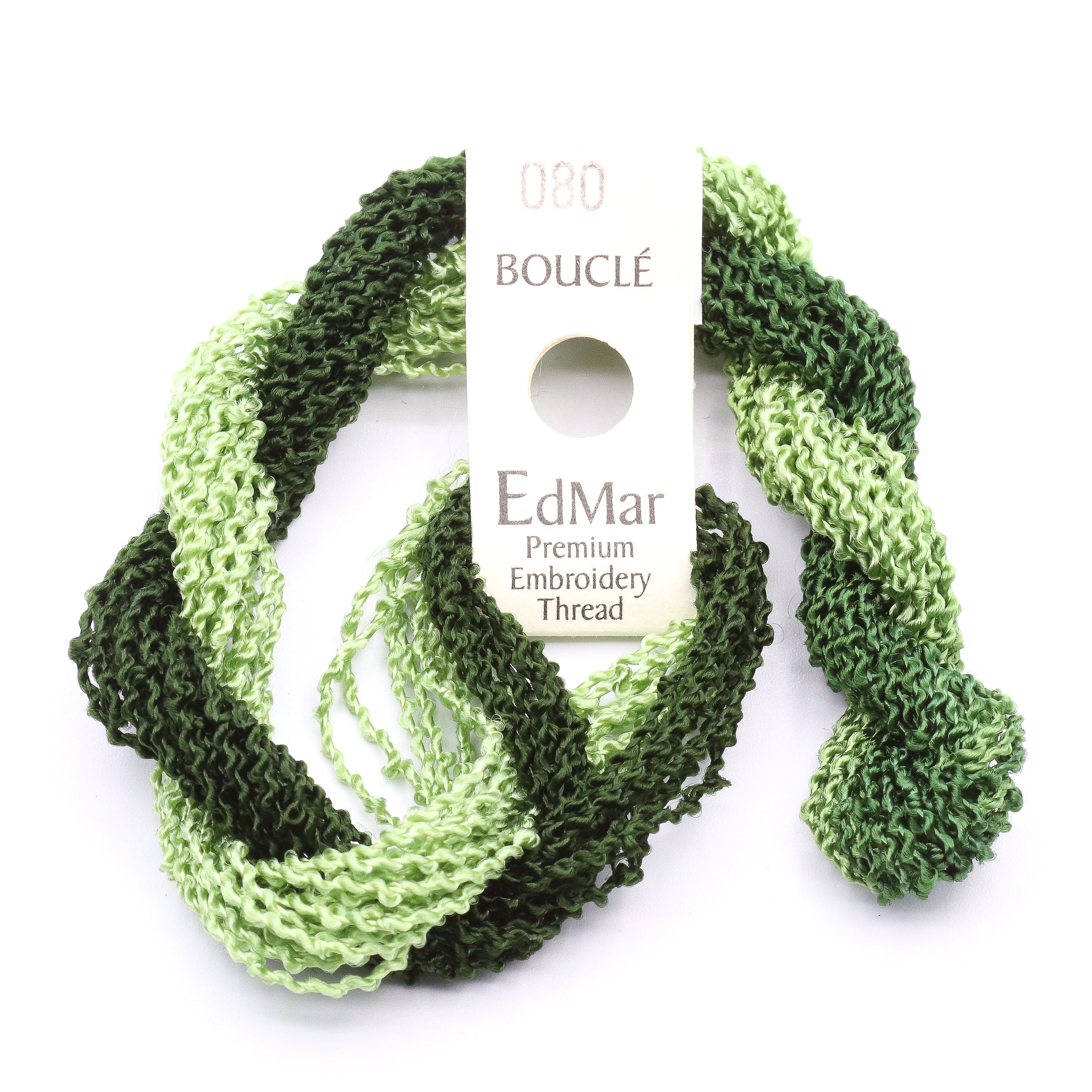 This is Boucle from EdMar in color 080 Dark to Pale Olive. 2 or 3 ply on 13 mesh, 1 ply on 18 mesh. Great for trees, clouds, water, or fur. Also try couching it for a different effect!