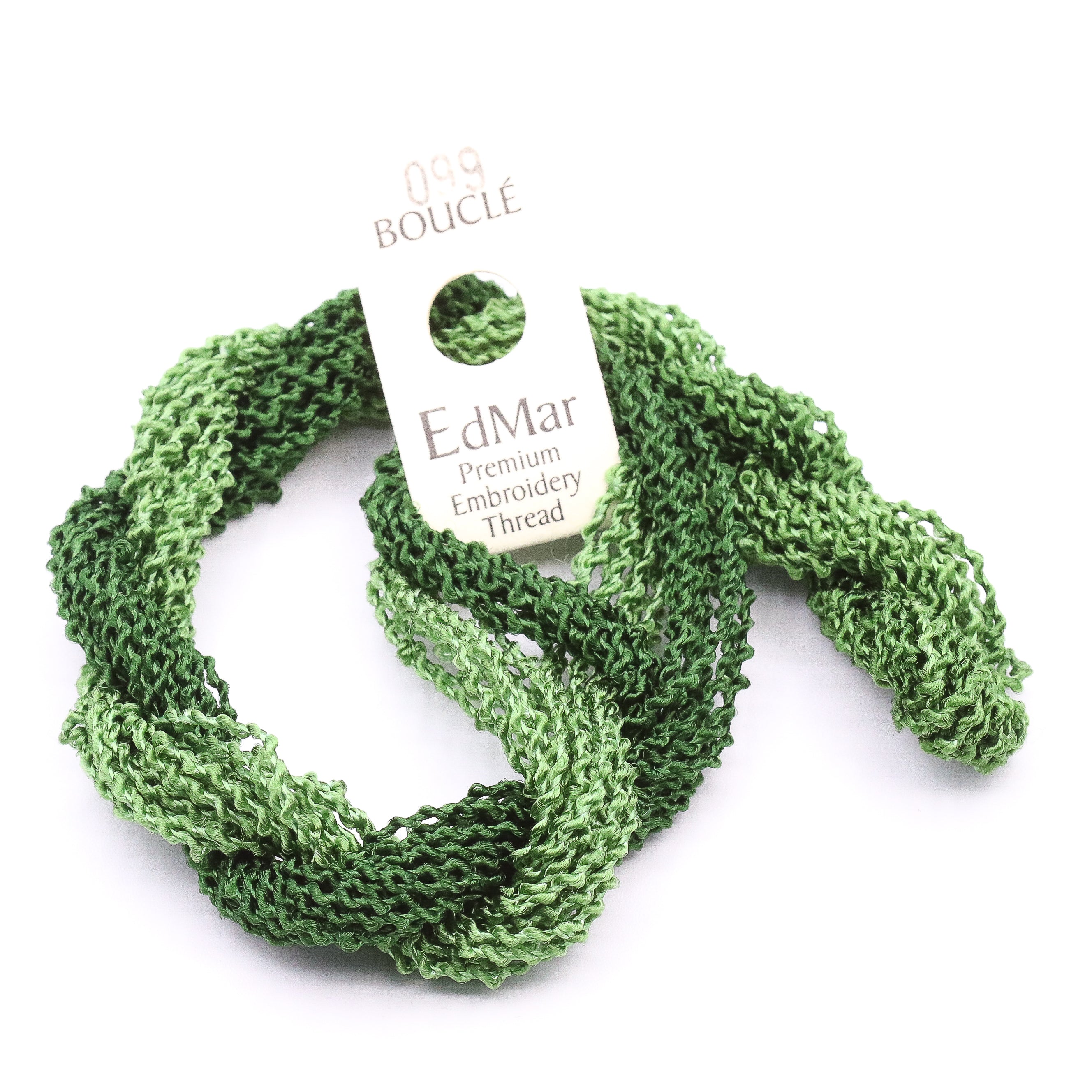 This is Boucle from EdMar in color 099 Medium to Pale Parsley. 2 or 3 ply on 13 mesh, 1 ply on 18 mesh. Great for trees, clouds, water, or fur. Also try couching it for a different effect!