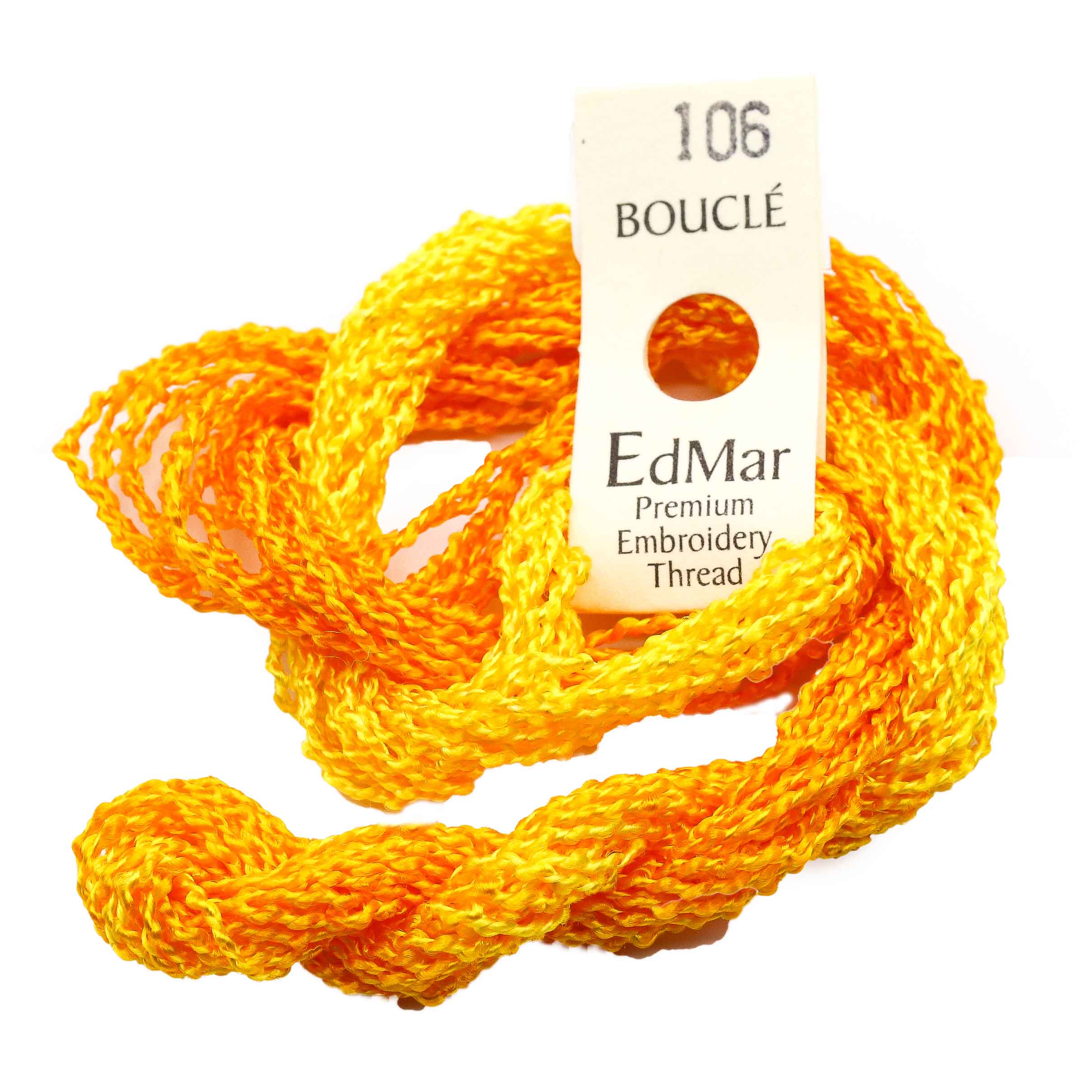 This is Boucle from EdMar in color 106 Medium to Light Amber. 2 or 3 ply on 13 mesh, 1 ply on 18 mesh. Great for trees, clouds, water, or fur. Also try couching it for a different effect!